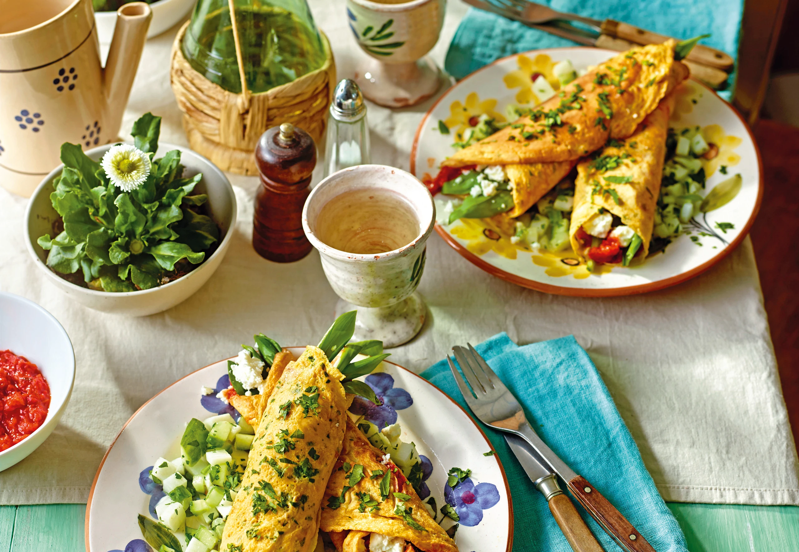 Eierröllchen mit Ajvar, Bärlauch, Feta und Rettich-Gurkensalat