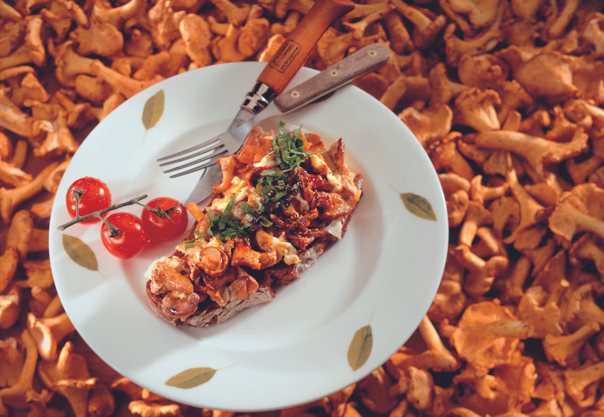 Eierschwammerl mit Ei auf Schwarzbrot