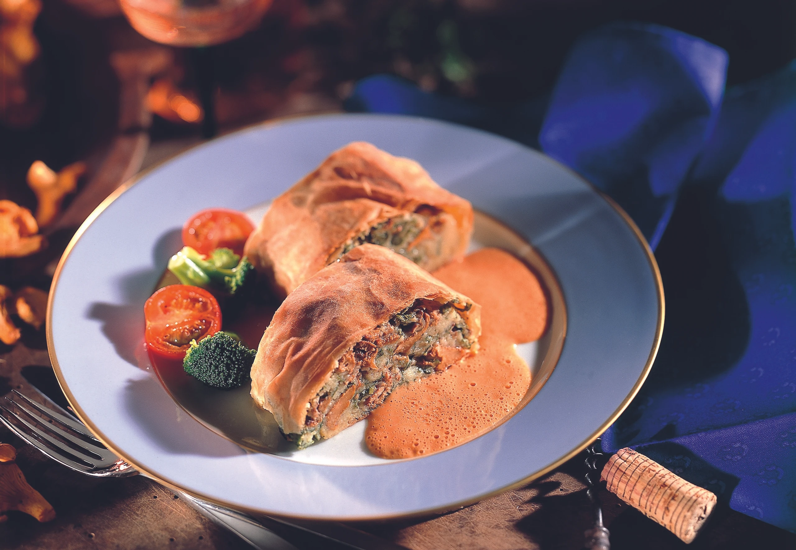 Eierschwammerl-Erdäpfel-Strudel mit Paradeissauce