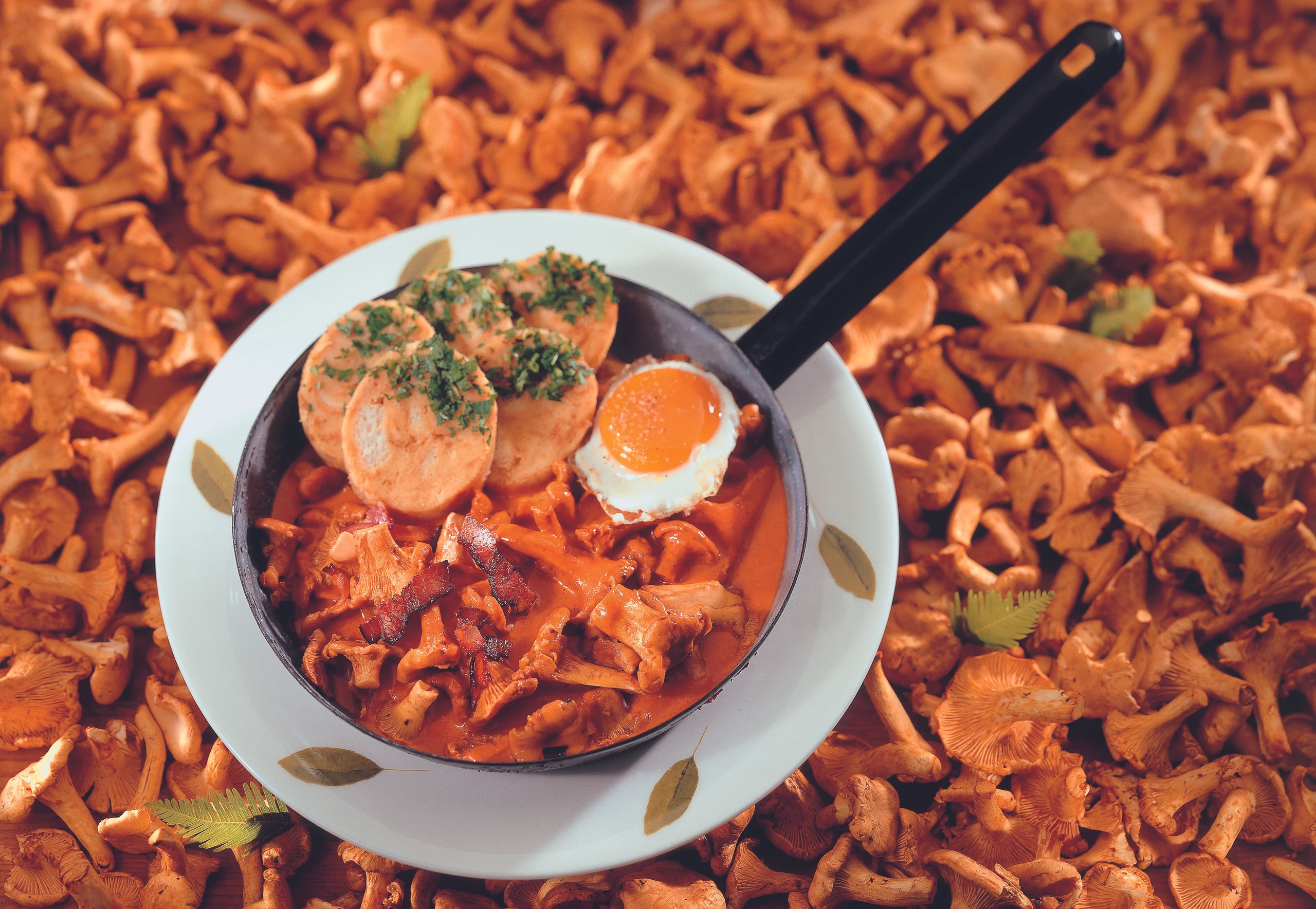 Sauerrahm mit Mehl verquirlen, in das Schwammerlgulasch rühren und ca. 1 Minute unter öfterem Umrühren köcheln. Parallel dazu in einer zweiten Pfanne das übrige Öl erhitzen, Eier hinein schlagen und bei schwacher Hitze braten. Eierschwammerlgulasch anrichten und mit den Spiegeleiern garniert servieren. Dazu passen Serviettenknödel.