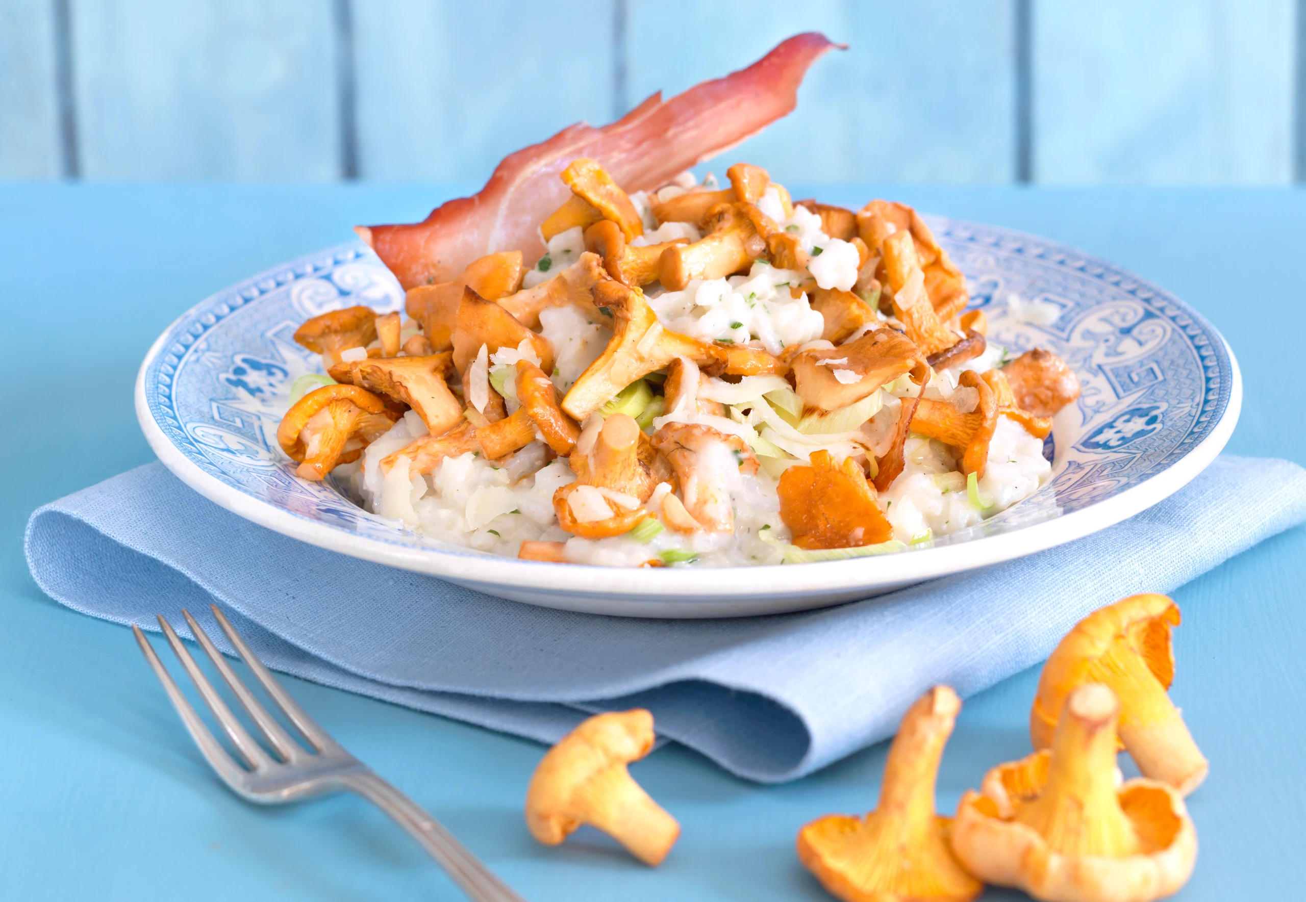 - Bergkäse und Schwammerln unter den Reis mischen. Risotto anrichten, mit Knusperschinken garnieren.