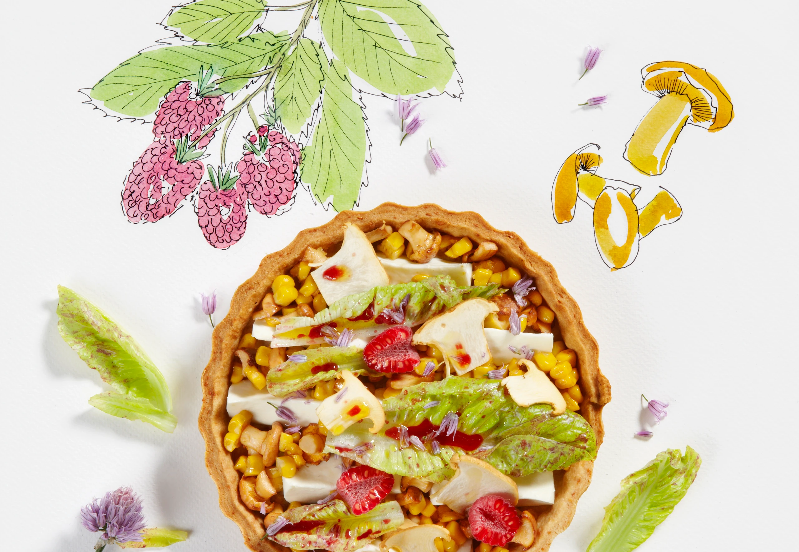 Eierschwammerl-Tarte mit Mais und Himbeeren