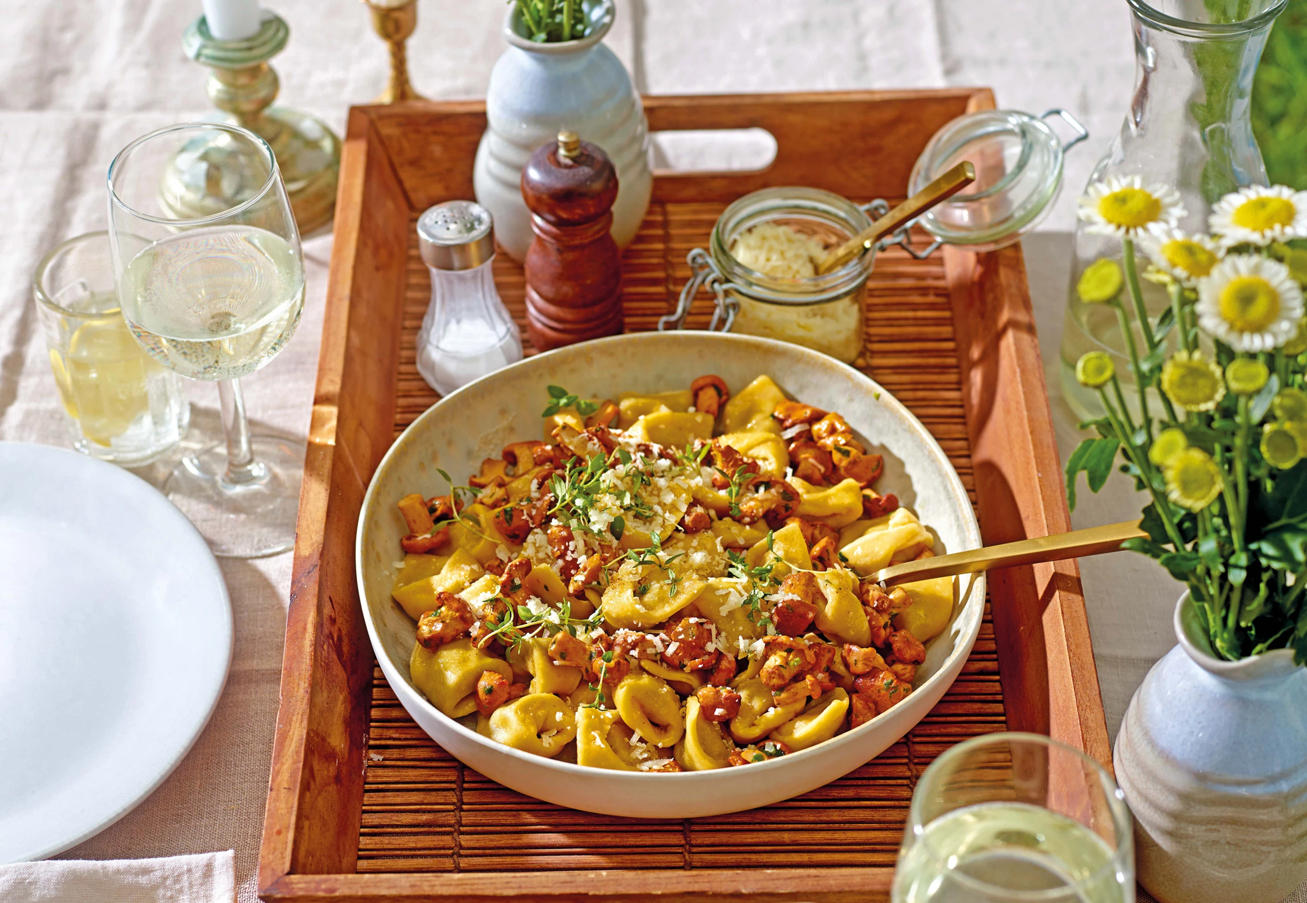 Tortellini mit einem Gitterlöffel herausheben, gut abtropfen lassen und mit den Schwammerln anrichten. Mit Butter übergießen und mit Parmesan und Majoran garniert servieren.