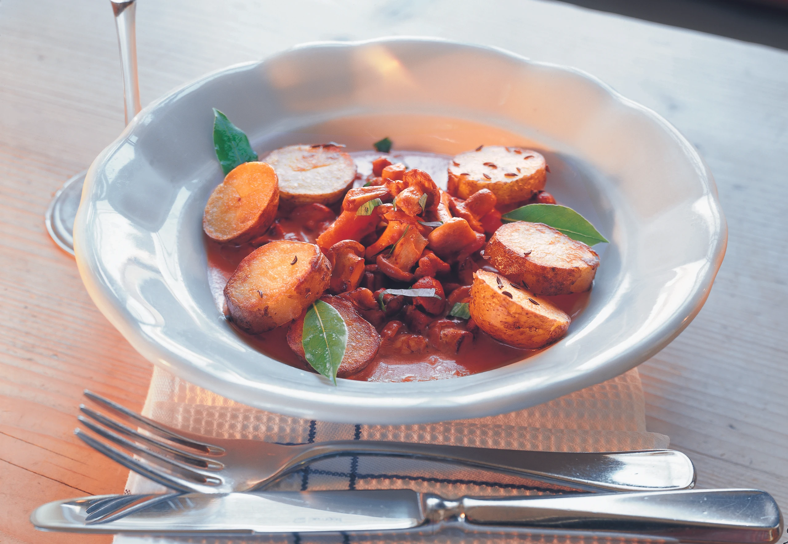 - Inzwischen Schwammerln putzen, kleine Exemplare ganz lassen, größere halbieren oder vierteln. In einer Pfanne Schwammerln in 30 g Butter ca. 3 Minuten anrösten und mit Kümmel würzen. Die Schwammerln zum Gulaschansatz geben und aufkochen. Obers zugießen und nochmals aufkochen. Lorbeerblatt entfernen, Schwammerlgulasch mit den Kartoffeln anrichten.