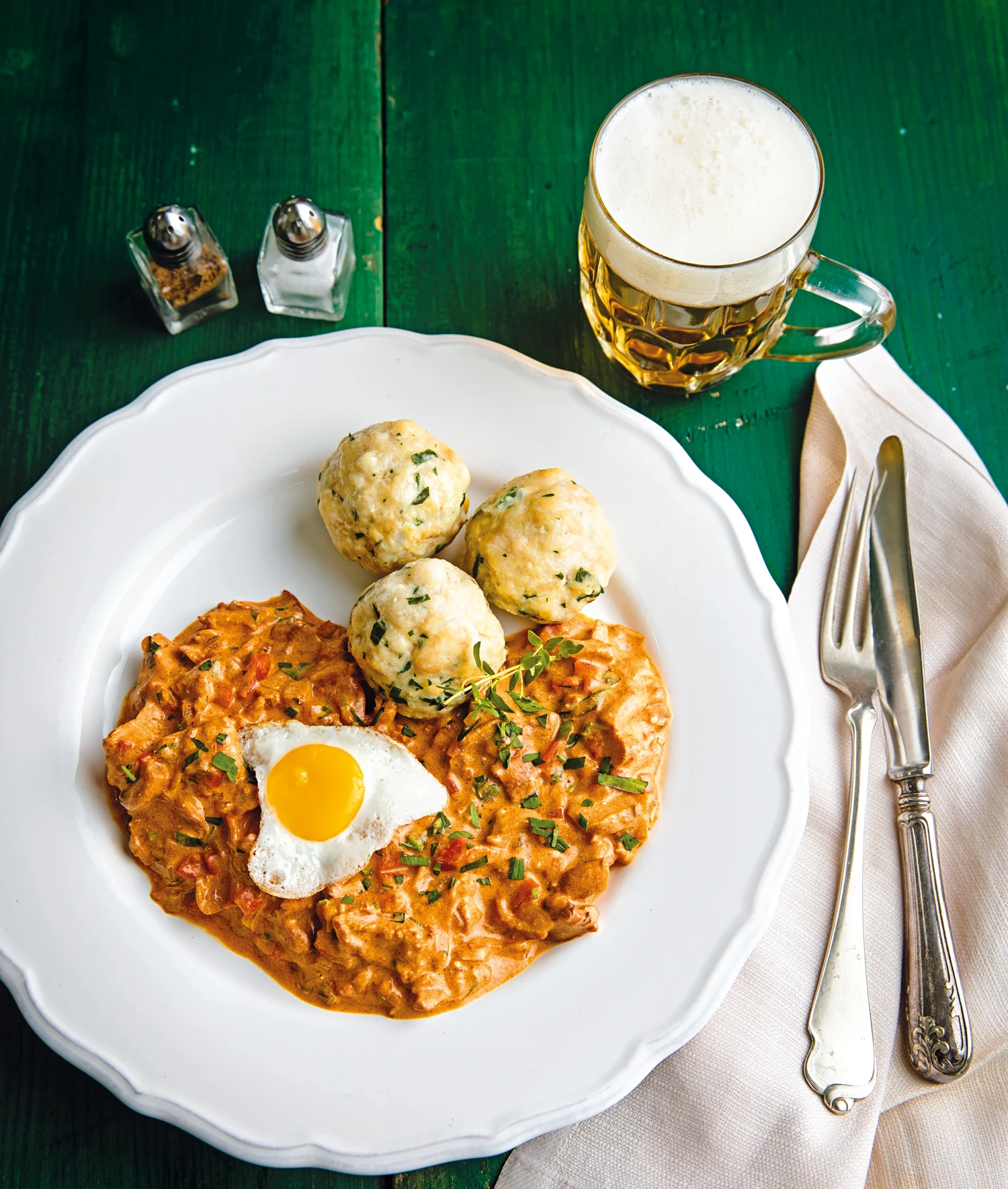 Eierschwammerlgulasch mit Semmelknödeln und Wachtelei