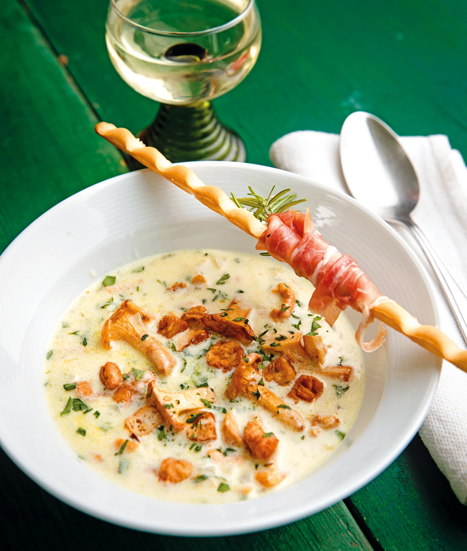 Eierschwammerlsuppe mit Grammeln und Schinken-Grissini