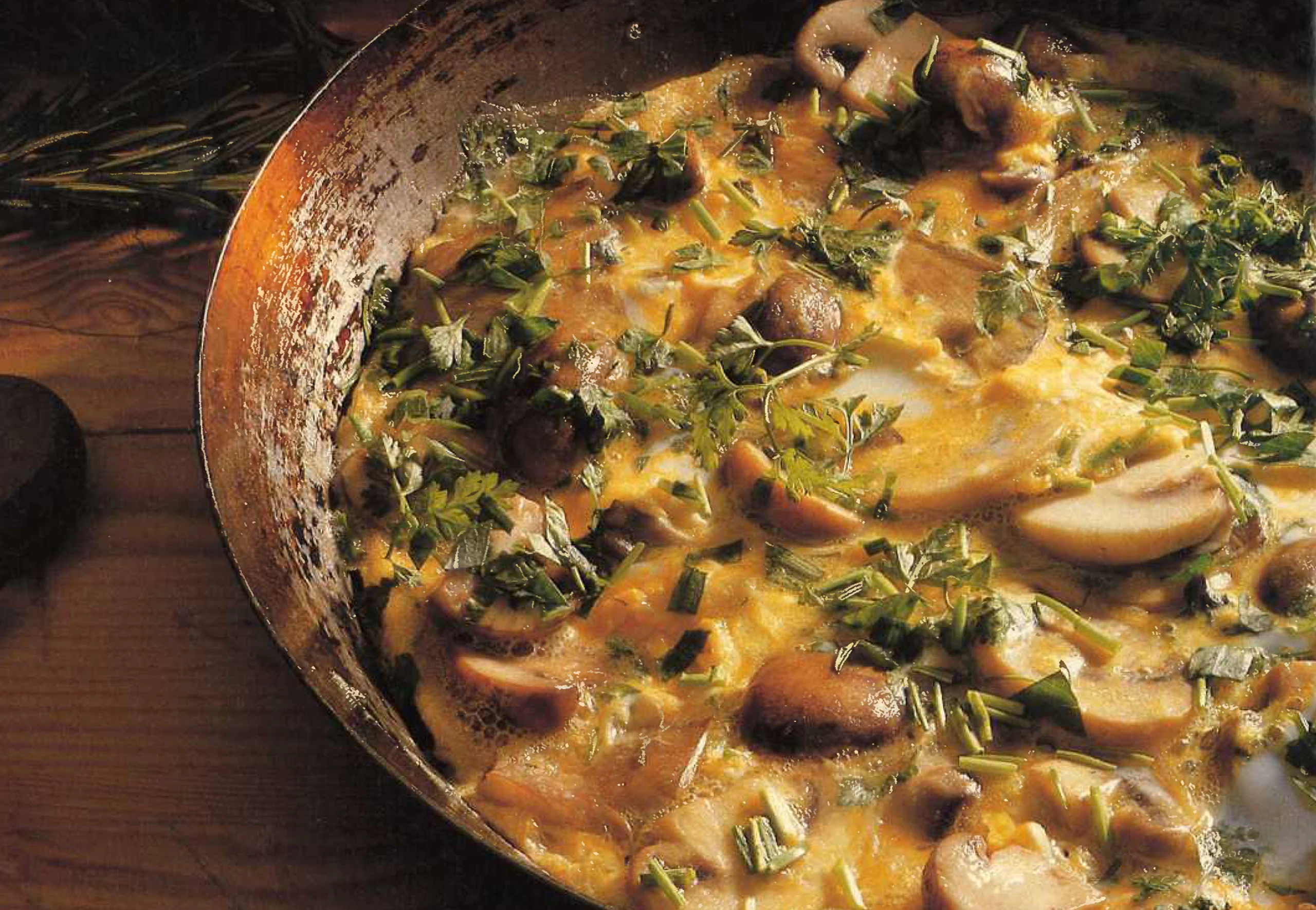 Eier mit einer Gabel verrühren, salzen und 2 EL der Kräutermischung zufügen. Sobald die Pilze kernig weich sind, Eier darüber gießen, mit einem Kochlöffel kräftig durchrühren. Die Eier cremig anstocken lassen und die Pfanne vom Herd nehmen (die Eimasse stockt noch nach).