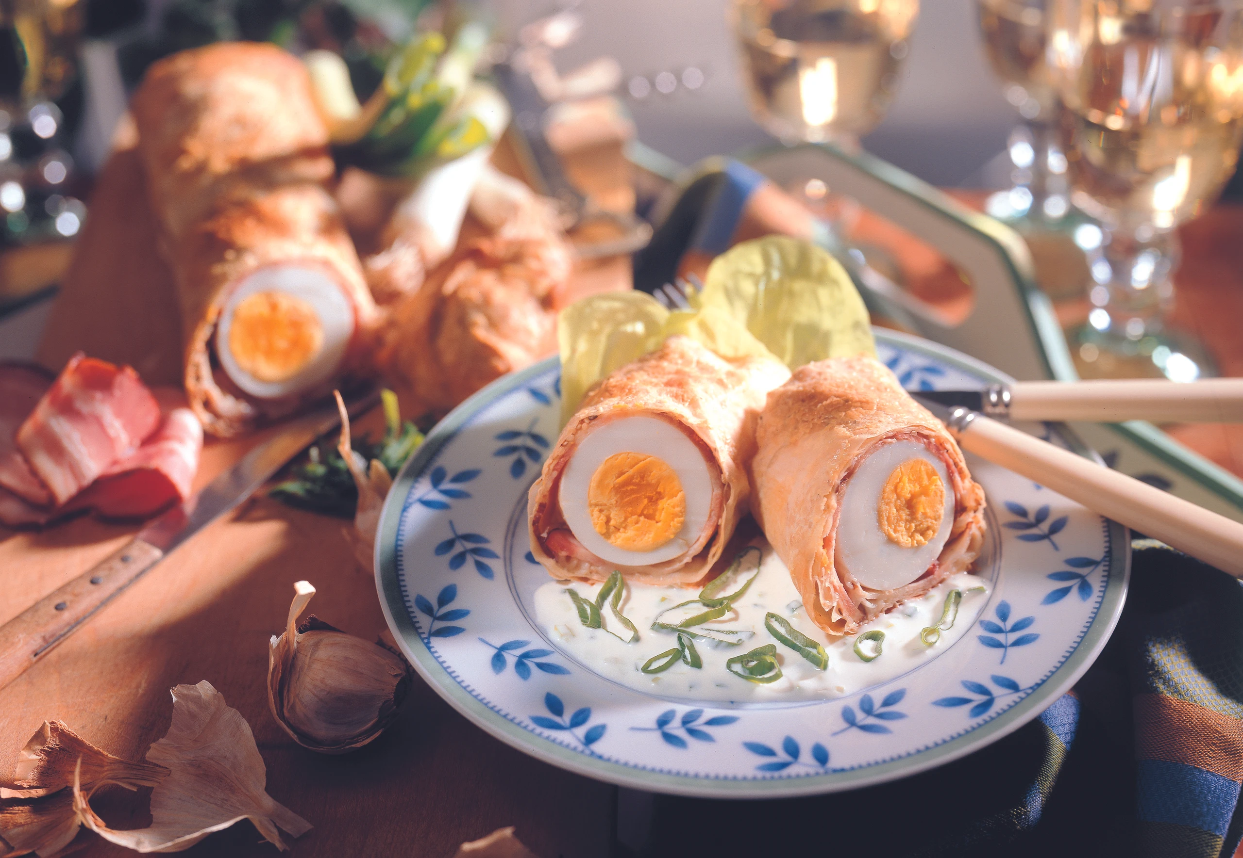 Speckscheiben auf den Teig legen und dünn mit Senf bestreichen, Eier (abgeflachte Seite unten) daraufsetzen, mit Salz und Pfeffer würzen. Seitenränder des Teiges einschlagen, Strudel von unten über die Eier einrollen.