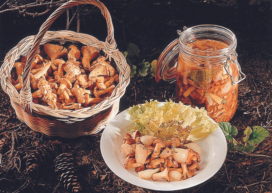 Schwammerln, Knoblauch und Zwiebeln in ein gut gesäubertes (steriles) Glas schichten und mit Marinade bedecken. Danach soviel Olivenöl zugießen, daß das Glas bis unter den Rand gefüllt ist. Anschließend Glas verschließen und kühl und dunkel aufbewahren. Man sollte die eingelegten Schwammerln erst nach frühestens einem Monat verzehren.