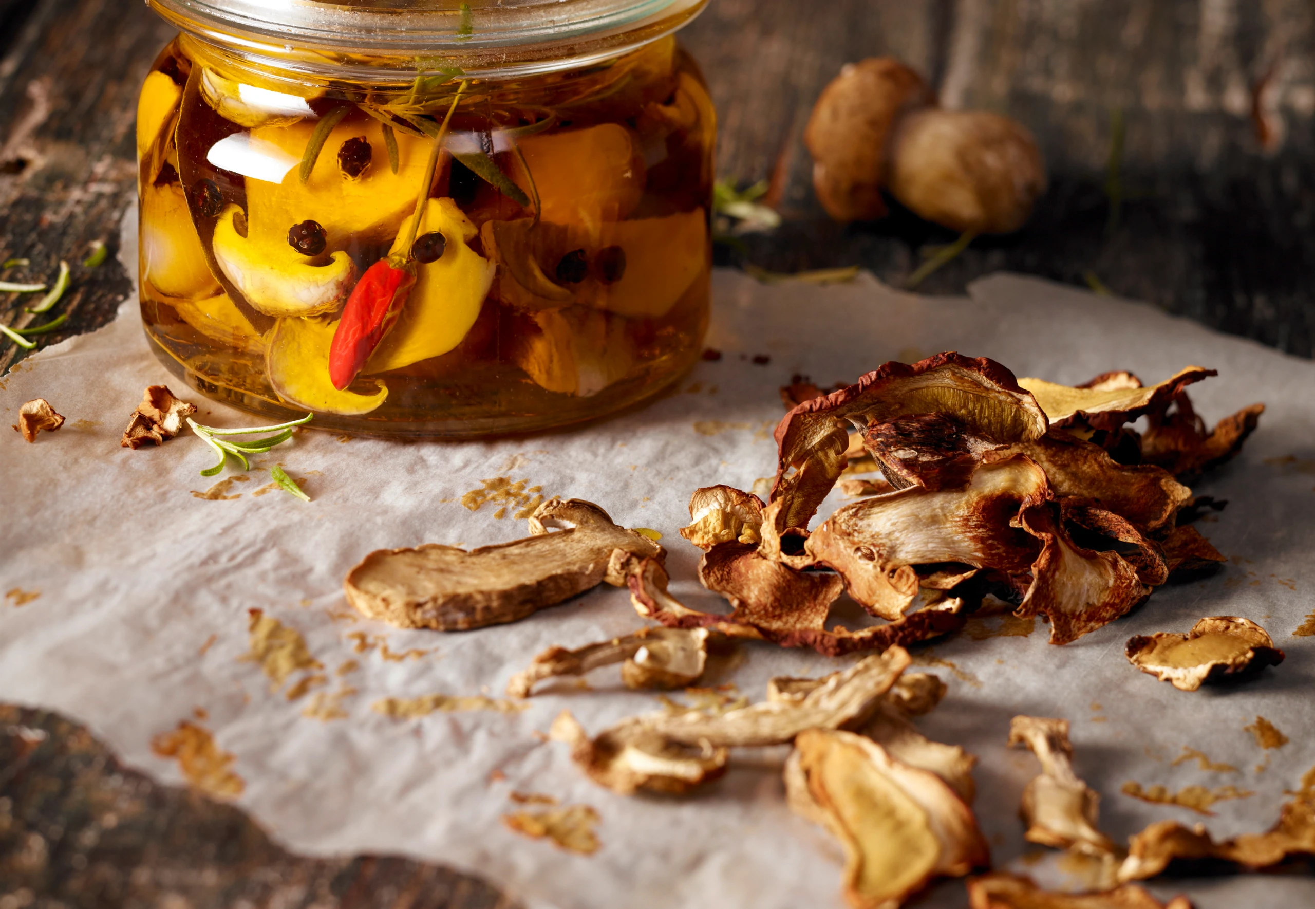- Essigsud abseihen, Pilze und Gewürze in ein Glas füllen. Olivenöl erwärmen und das Glas damit auffüllen. Glas gut verschließen, Pilze ca. 2 Tage durchziehen lassen.