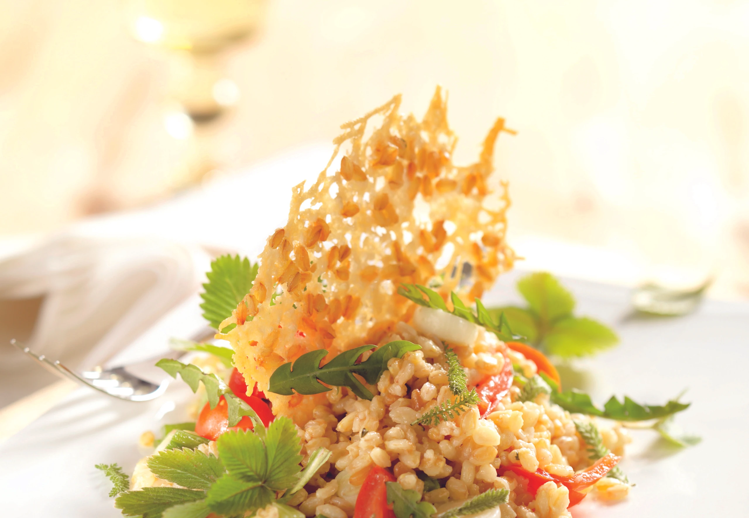 - Reis mit Paradeisern, Kräutern, Zitronensaft, Öl und etwas Salz vermischen. Salat mit den Crisps servieren.