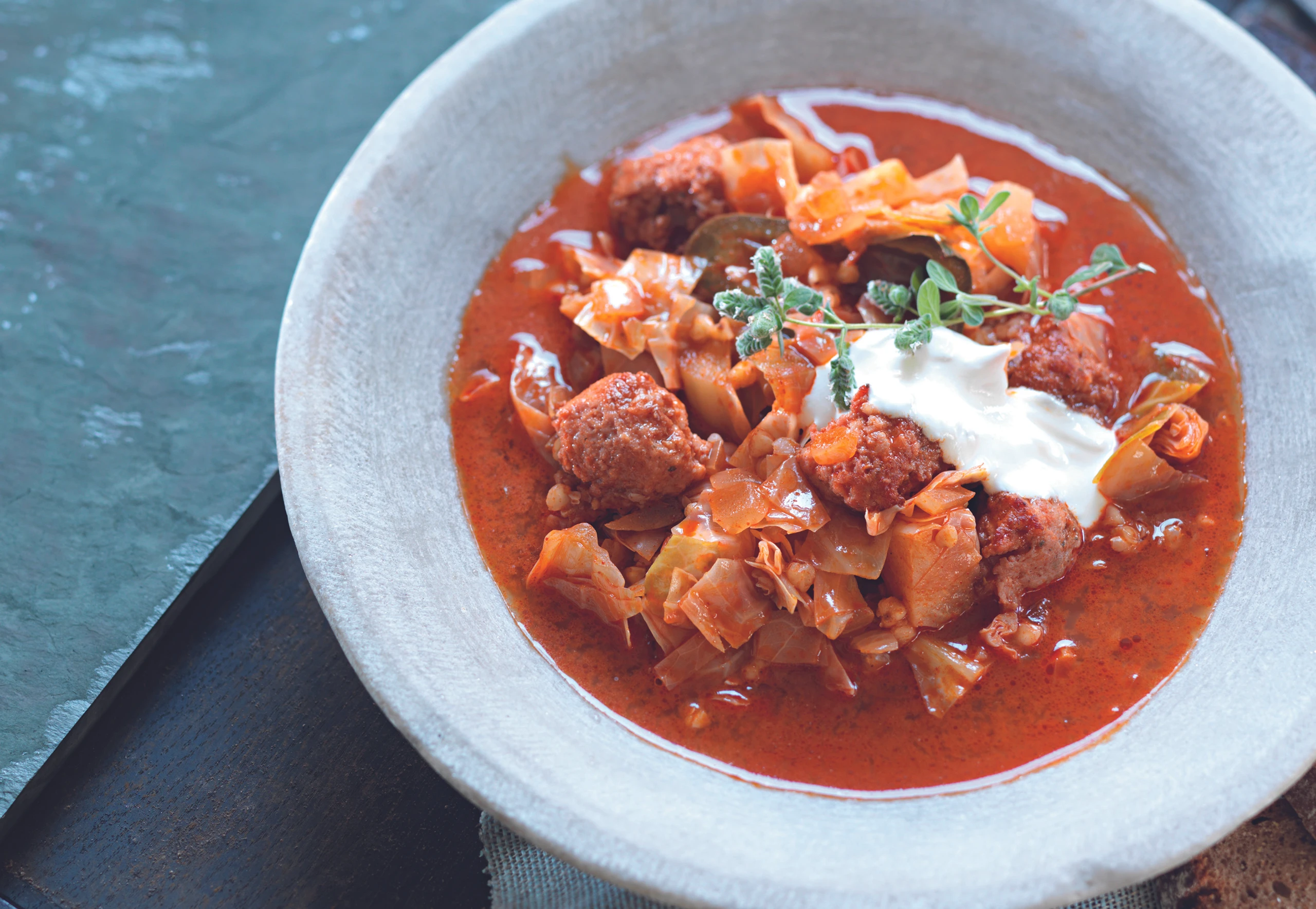 Sauerrahm mit wenig von der Kochflüssigkeit glatt rühren und in den Eintopf gießen. Eintopf mit frischem Majoran bestreut servieren.