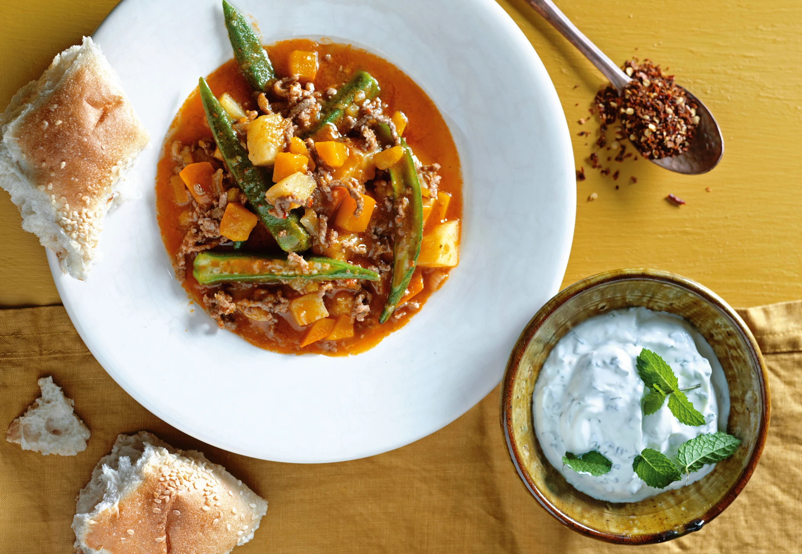 Faschiertes in Öl anrösten, Zwiebeln und Knoblauch unterrühren und mitbraten. Paradeismark unterrühren, kurz mitrösten und mit Suppe aufgießen. Erdäpfel und Kürbis unterrühren. Eintopf mit Salz, Pfeffer, Chiliflocken, Kreuzkümmel und Zimt würzen und ca. 30 Minuten dünsten. Gegen Ende der Garzeit Okra unterrühren und mitgaren. Eintopf mit JoghurtMinzesauce servieren. Dazu passt Fladenbrot.
