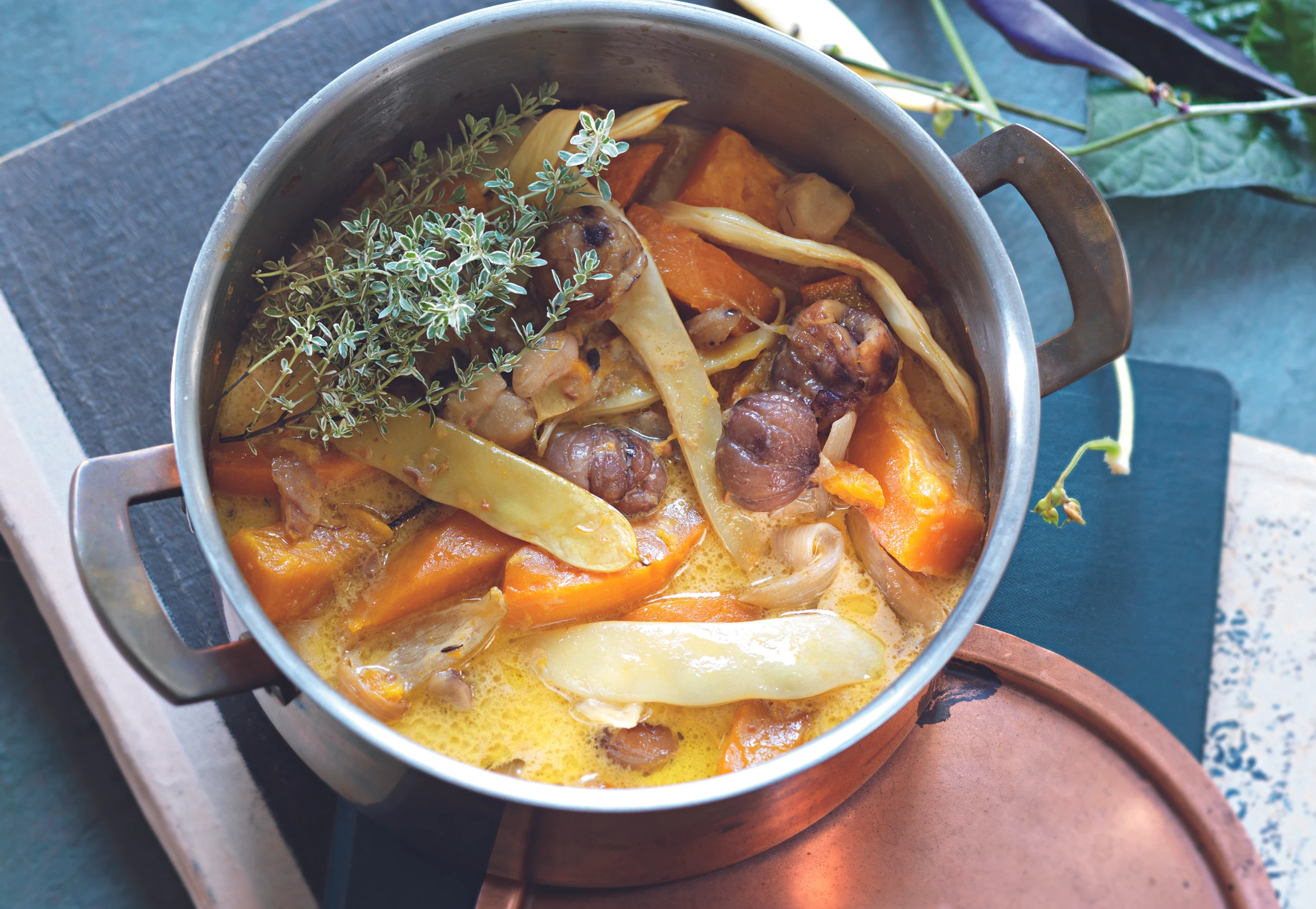 Bohnen abgießen, in ca. 500 ml Wasser 30 Minuten kochen. Kürbis entkernen und in fingerdicke Spalten schneiden. Perlzwiebeln schälen. Fisolen putzen und quer halbieren.