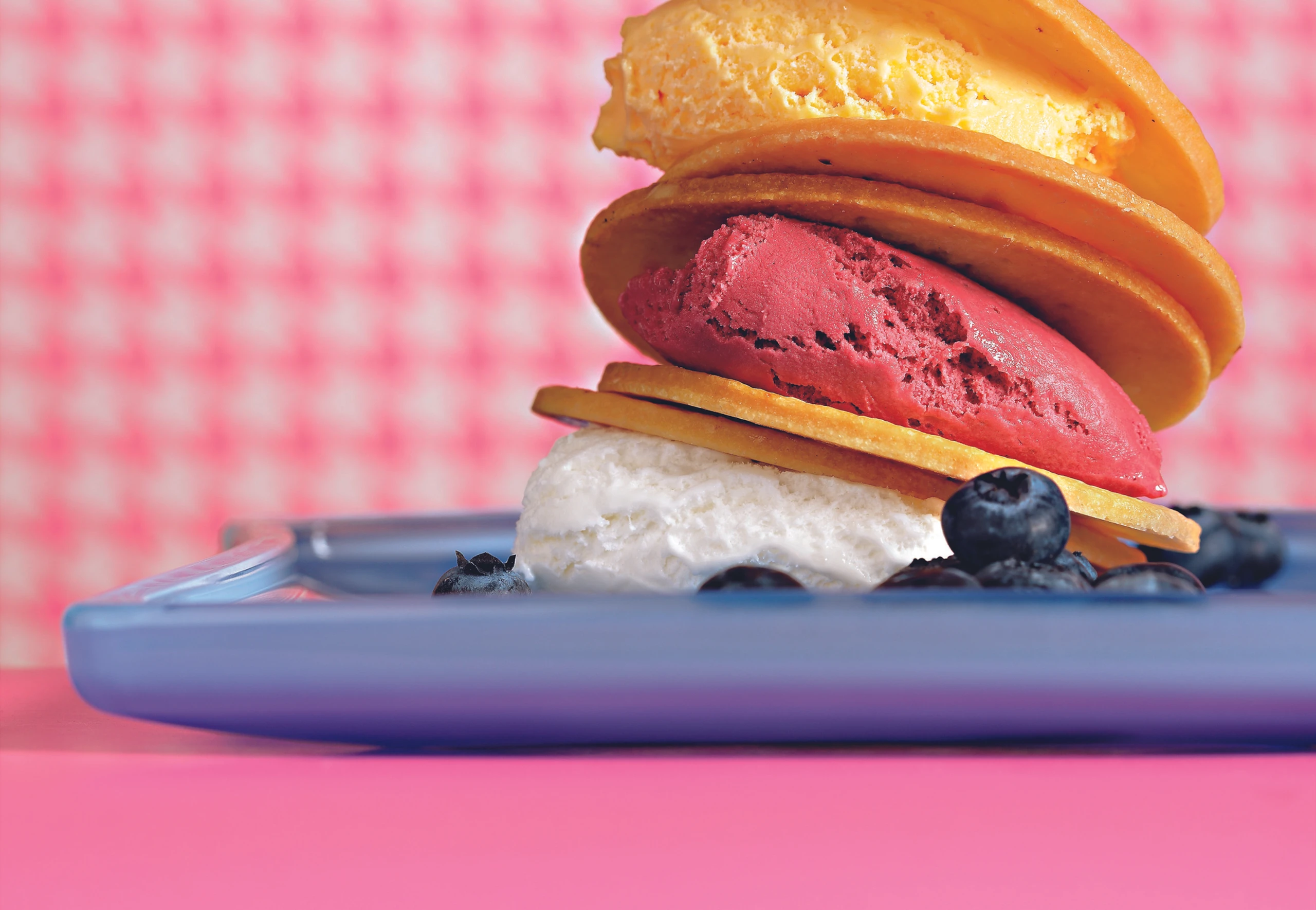 Mit einem Löffel Nockerl vom Eis ausstechen. Plätzchen mit den Eisnockerln zusammensetzen. Mit Heidelbeeren garniert servieren.