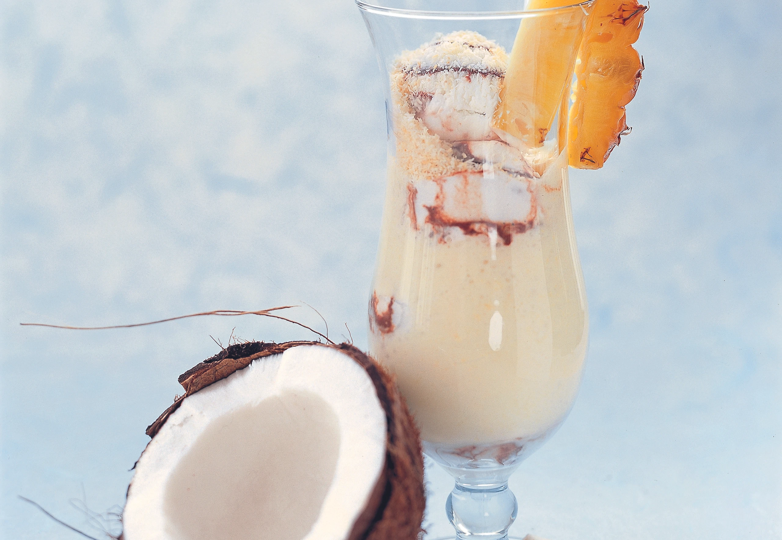 Für die Piña Colada Rum, Ananassaft, Cream of Coconut und 2–3 Kugeln vom Eis mit einem Stabmixer aufschlagen. Drink in Cocktailgläsern verteilen, je 2 Kugeln Eis zugeben und mit Kokosette bestreuen. Mit den Ananasspalten dekorieren.