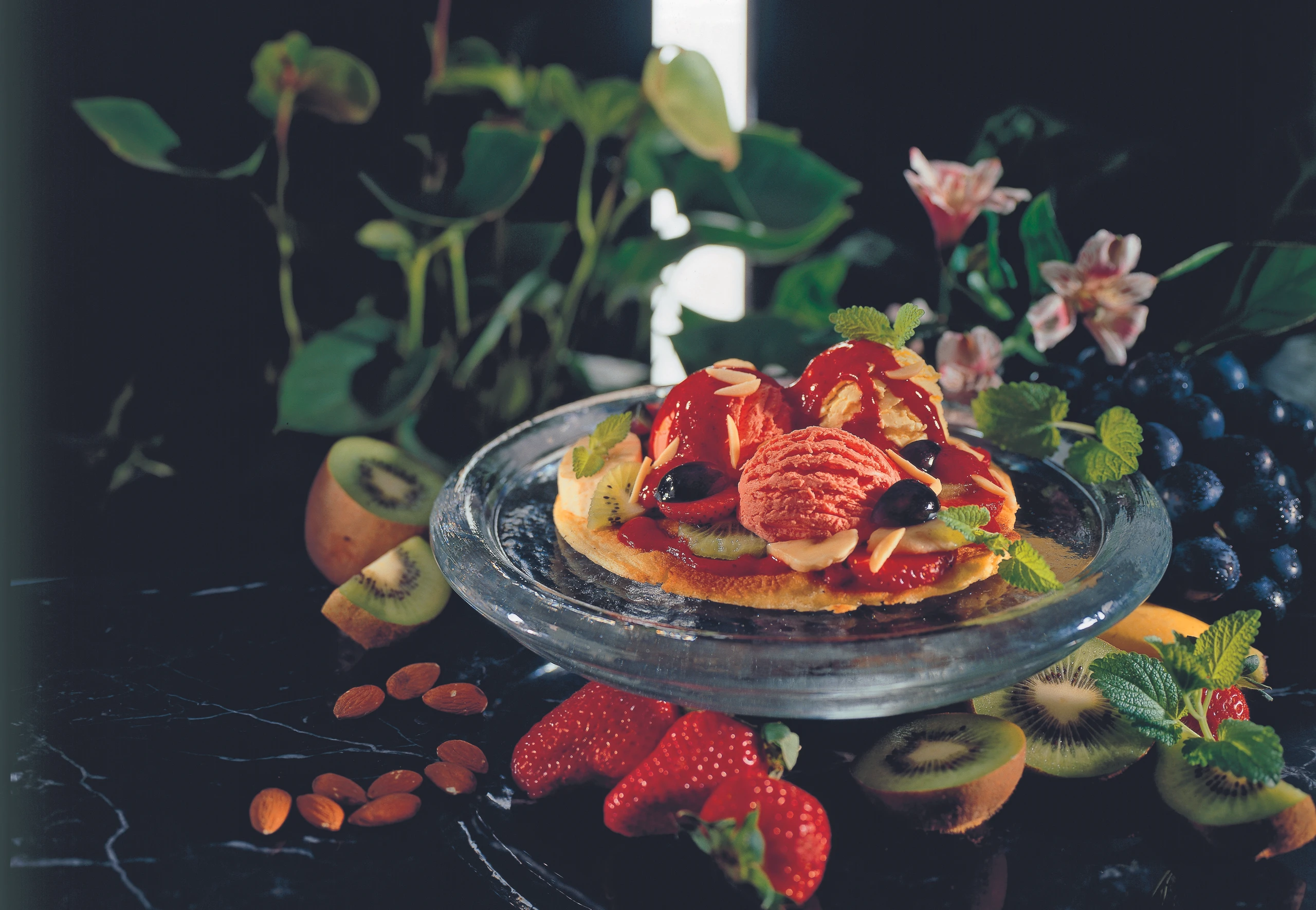 Omeletts mit dem Erdbeerpüree bestreichen, Eis darauf anrichten und mit den Früchten, gerösteten Mandelstiften und Zitronenmelisse garnieren.