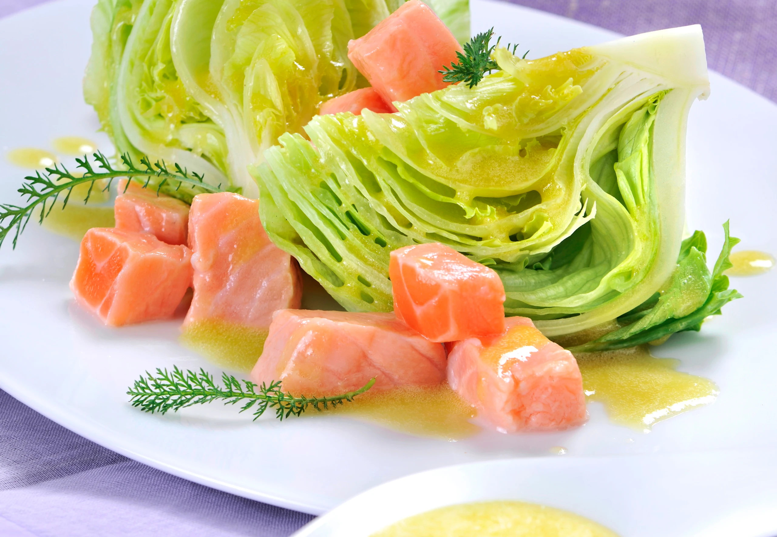 Salatvierteln mit den Lachswürfeln anrichten, mit Orangendressing beträufeln und mit Kräutern garnieren.