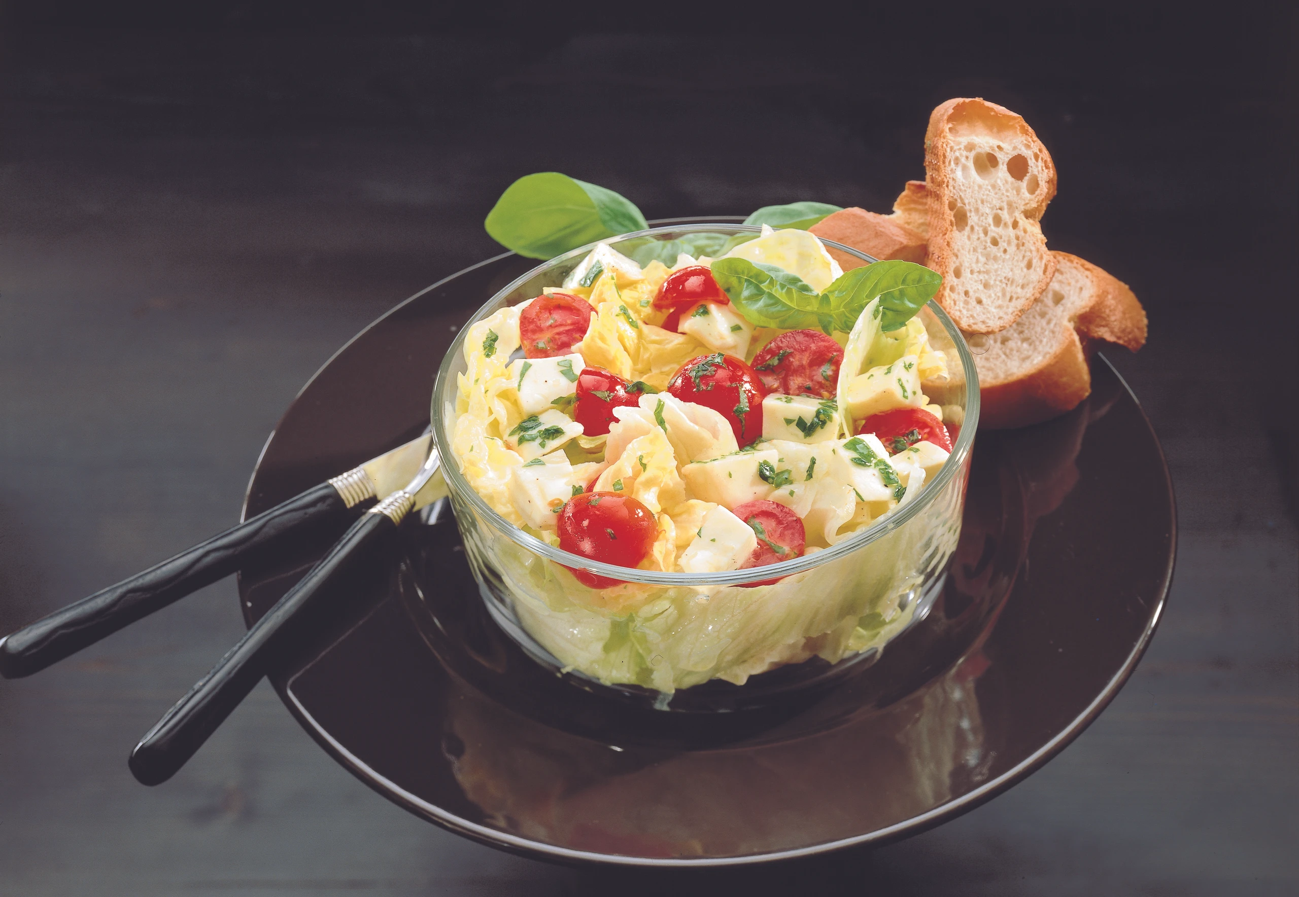- Mozzarella, Paradeiser und Salat mit der Marinade übergießen, behutsam vermischen und anrichten. Mit Baguette oder anderem Weißbrot servieren.
