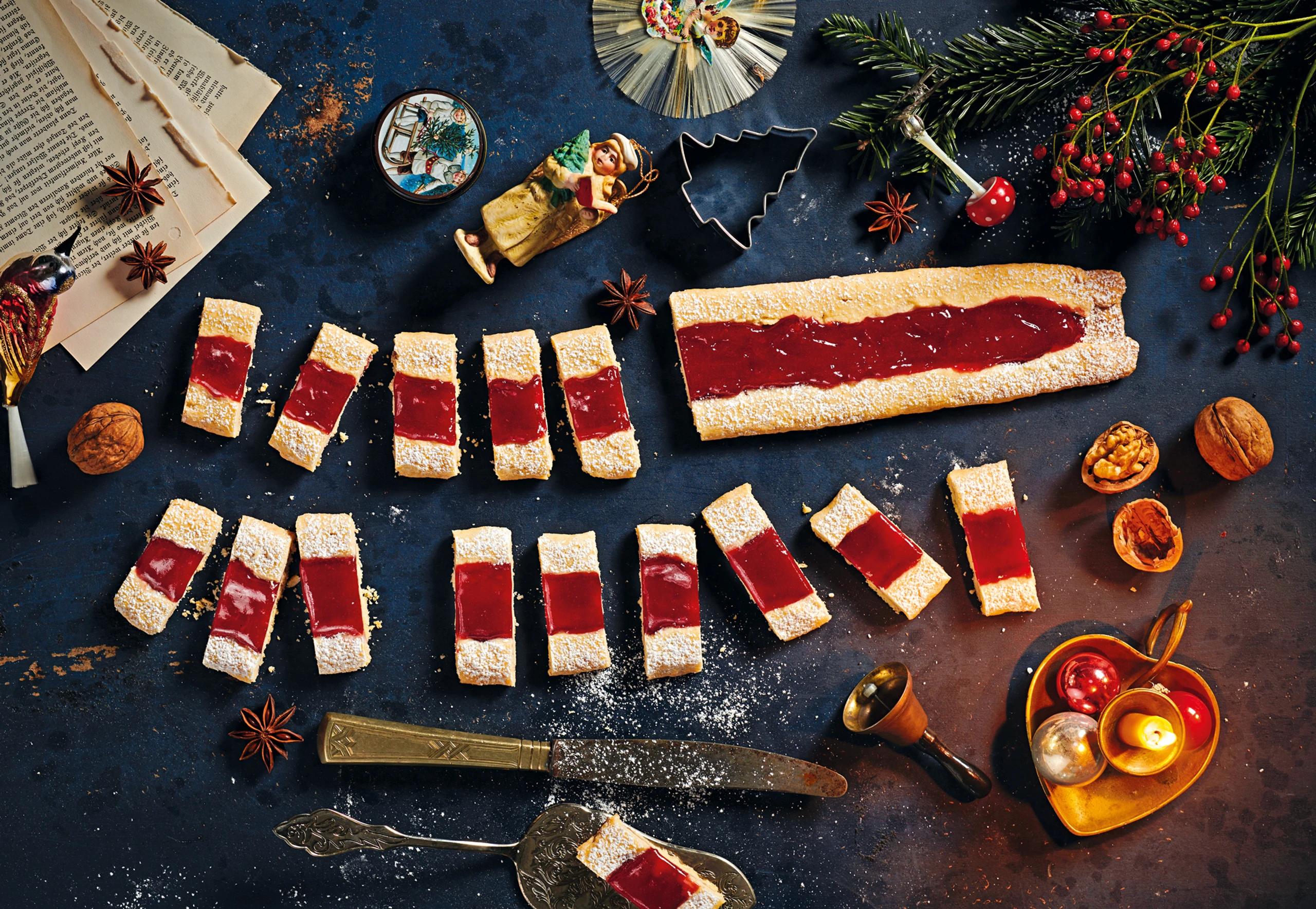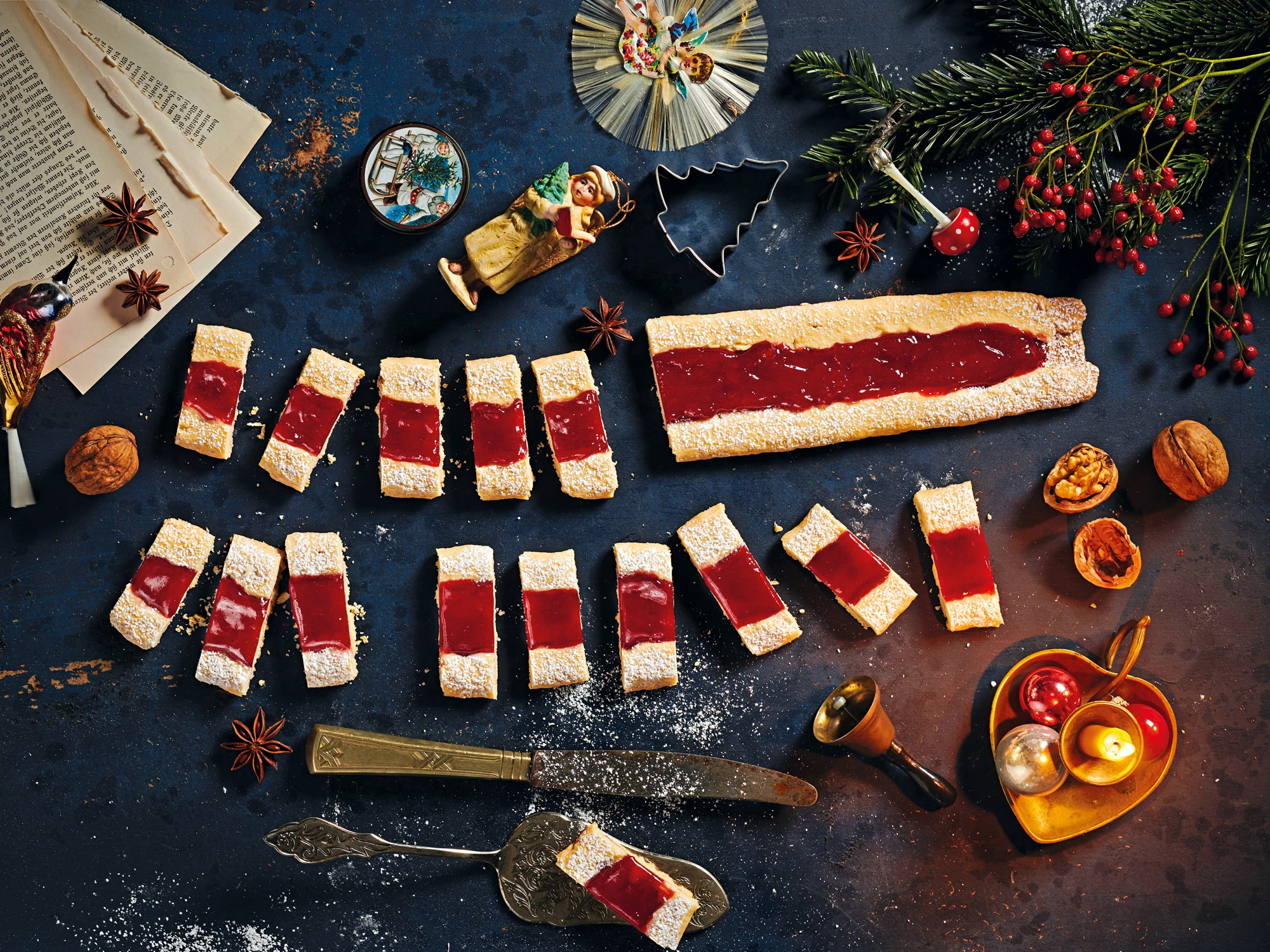 Teig auf einer leicht bemehlten Arbeitsfläche halbieren. Jedes Teigstück zu einem langen Streifen (35 x 10 cm) ausrollen. Teigstreifen auf das Blech legen und mittig mit der Marmelade bestreichen. Ober- und Unterseite der Teigstreifen einschlagen. In der Mitte soll ein ca. 3 cm breiter Streifen frei bleiben. Im Rohr (mittlere Schiene) ca. 17 Minuten hell backen. Herausnehmen und abkühlen lassen.