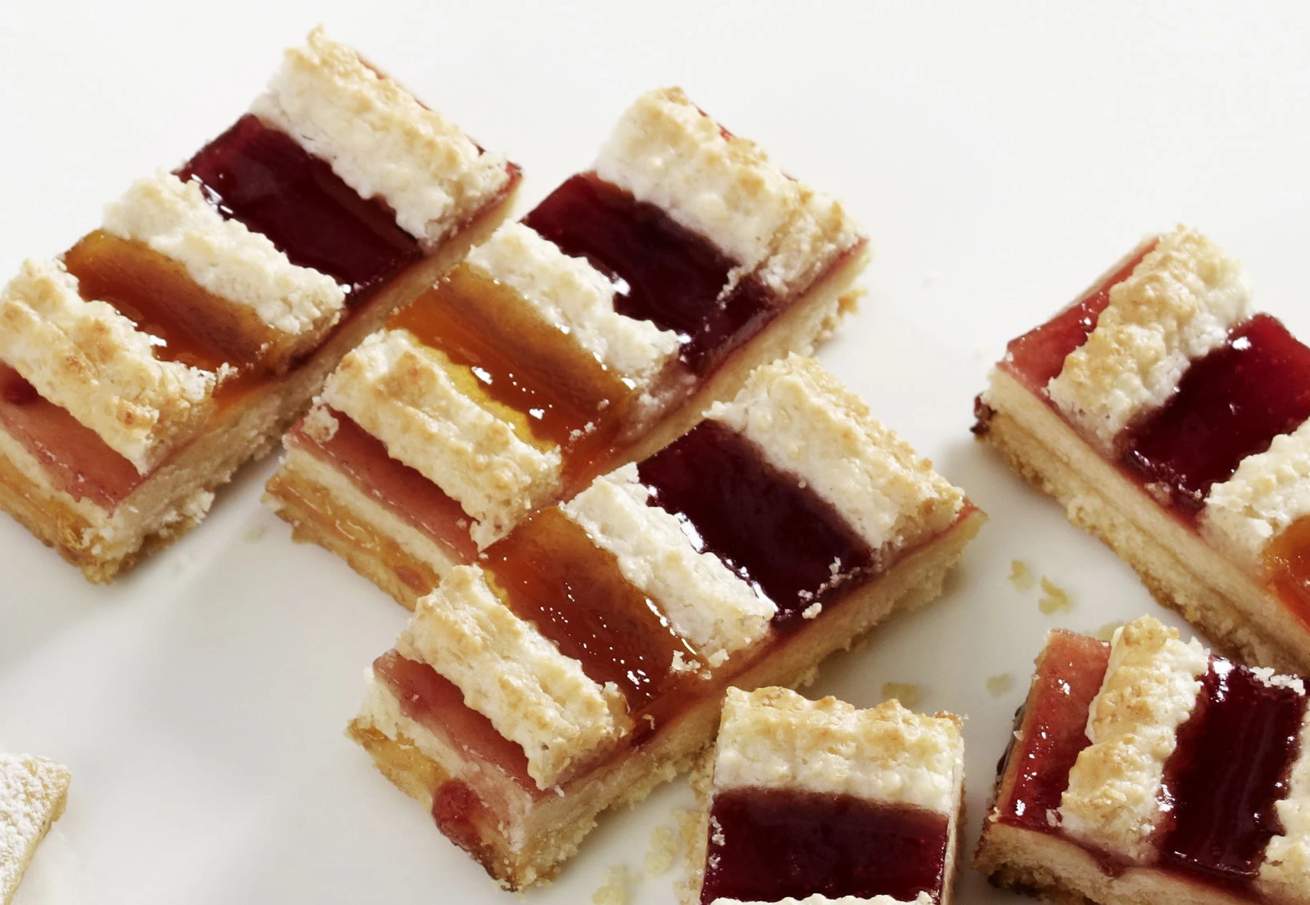 Teig halbieren. Jede Hälfte auf einer bemehlten Arbeitsfläche auf Backblechgröße ausrollen, auf die Bleche legen und mit einer Gabel in kurzen Abständen einstechen. Teige im Rohr (mittlere Schiene) nacheinander ca. 8 Minuten backen. Einen Teig noch warm mit 100 g von der Marillenmarmelade bestreichen, übrigen Teig darauf legen und mit 100 g von der Himbeermarmelade bestreichen. Teigstück in 8 ca. 5 cm breite Streifen schneiden.