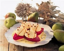- Portwein, Zimt und Gewürznelken mischen und in einem höheren Topf (Ø ca. 20 cm) aufkochen. Birnenhälften einlegen (müssen mit Flüssigkeit gut bedeckt sein) und bei schwacher Hitze ca. 5 Minuten köcheln. Birnen dabei öfters wenden, damit sie gleichmäßig gar und rot werden. Birnen vom Herd nehmen und im Weinfond auskühlen lassen.