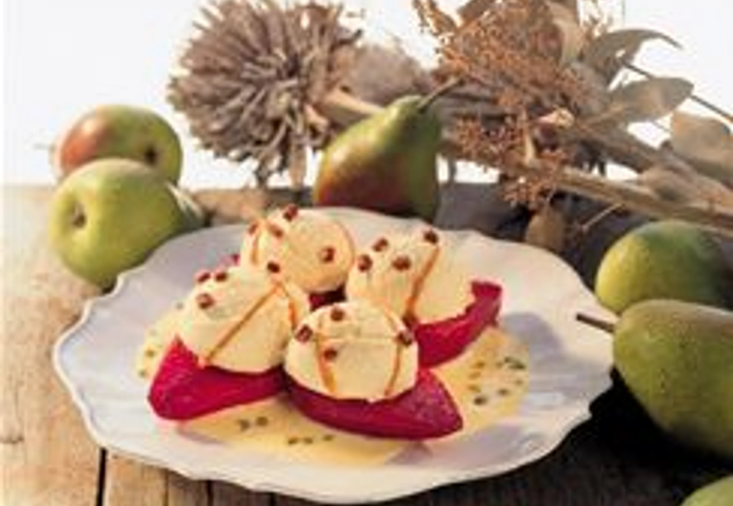 - Birnen aus dem Fond heben und auf Küchenpapier gut abtropfen lassen. Eine Kugel Eis auf jede Birnenhälfte setzen. Vanillesauce aufrühren und mit gehackten Pistazien vermischen. Birnen mit der Sauce garniert servieren.