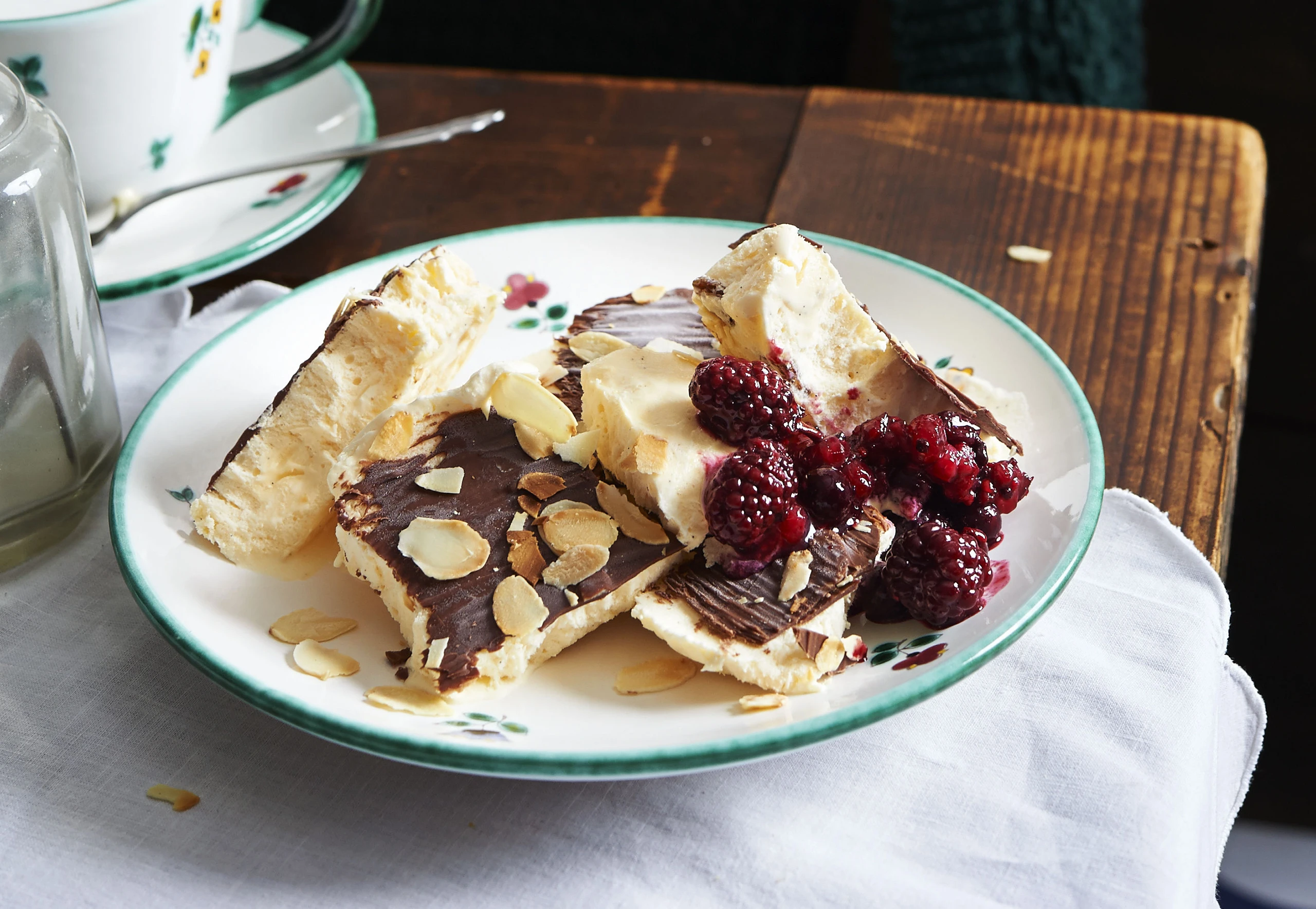 Für die Glasur Kuvertüre hacken und über Wasserdampf schmelzen. Öl unterrühren. Parfait damit einpinseln, rasch mit den Mandeln bestreuen und 10 Minuten tiefkühlen.