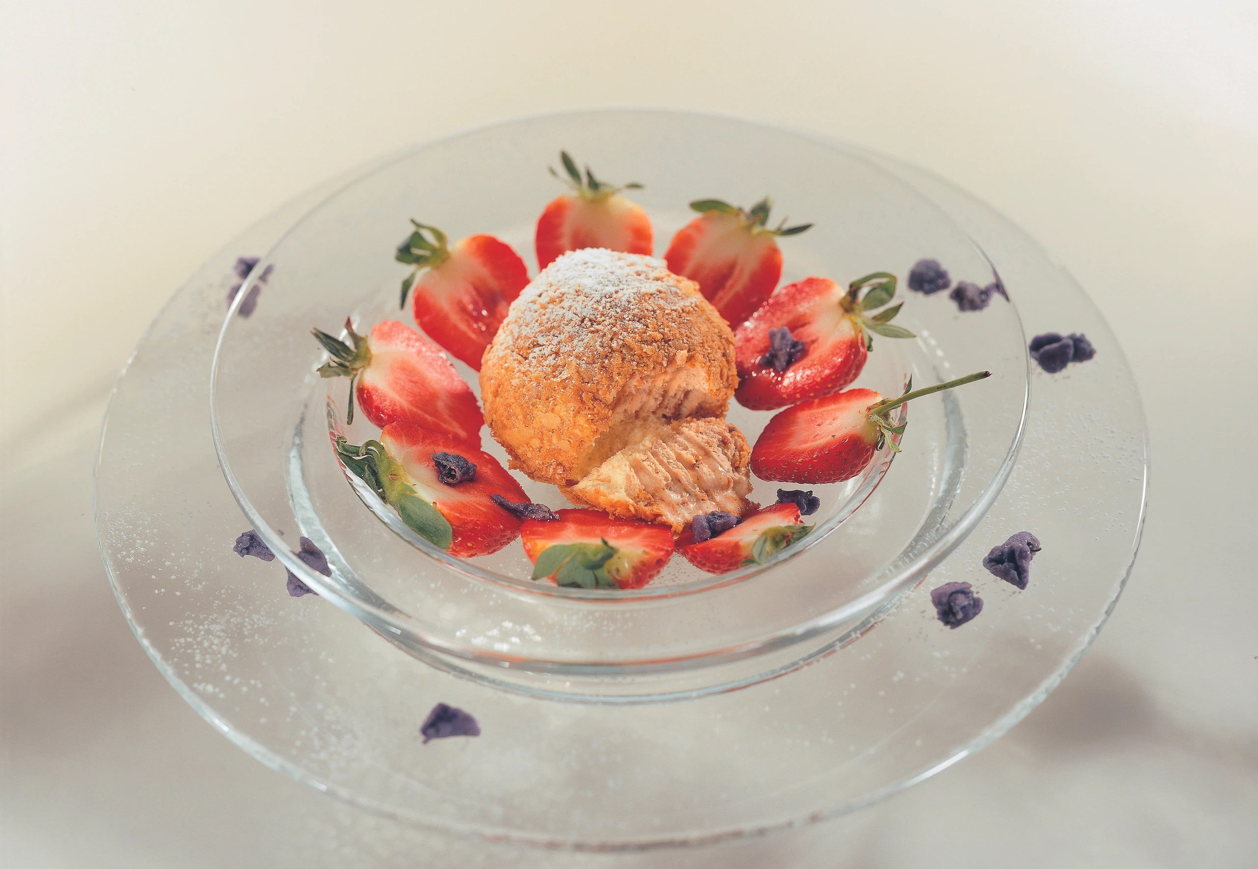 Erdbeeren der Länge nach halbieren, auf Tellern kreisförmig anrichten und mit den Veilchen bestreuen.