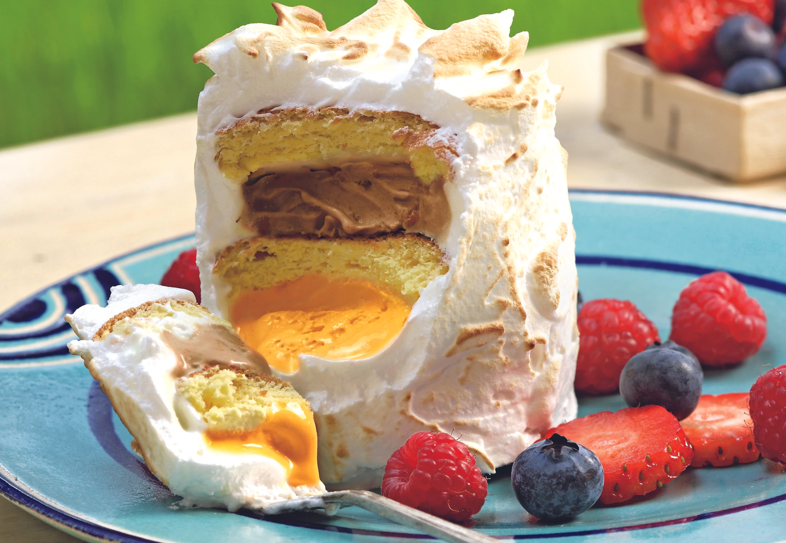 Biskuit aus dem Rohr nehmen, vom Blech ziehen und abkühlen lassen. Mit einem Ausstecher (Ø 5 cm) 16 Scheiben ausstechen. 12 davon mit ein wenig von jeder Eissorte belegen und übereinandersetzen. Mit übrigen Scheiben belegen. Törtchen für ca. 3 Stunden tiefkühlen.