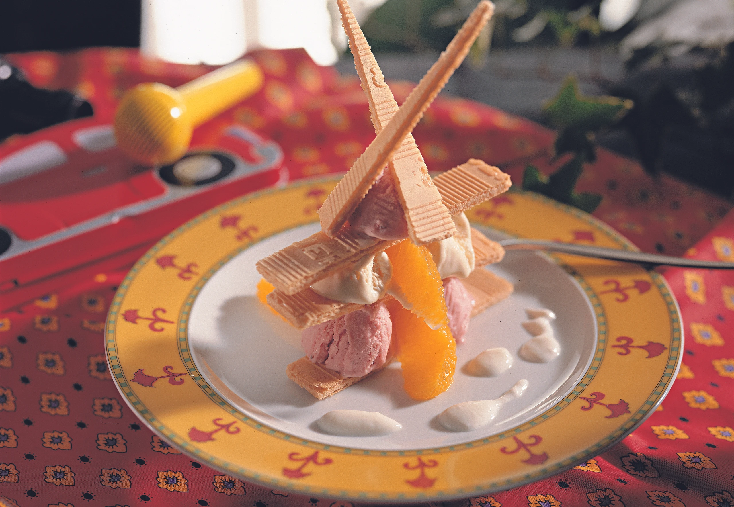 Vier Eiswaffeln diagonal halbieren. Die restlichen Waffeln abwechselnd mit den Eiskugeln und den Orangenfilets übereinander setzen. Obenauf die halbierten Waffeln setzen. Joghurt verrühren und die Eisdesserts damit garnieren.