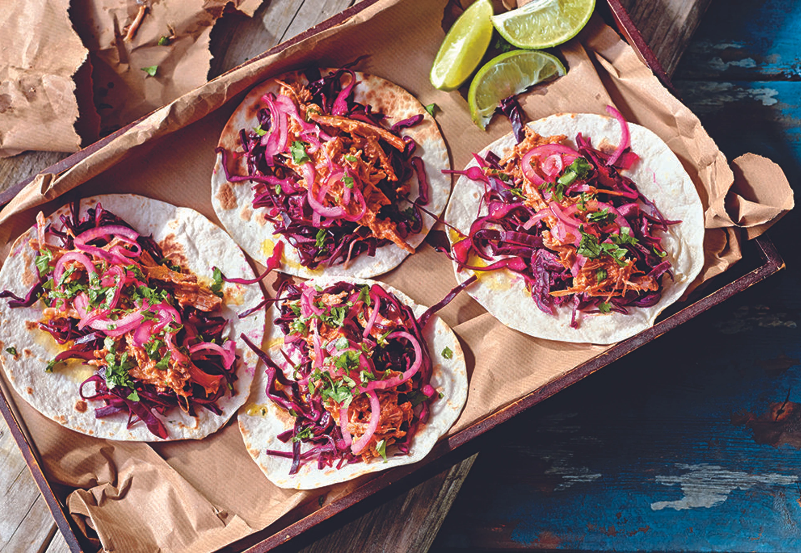 Fleisch mit einer Gabel fein zerpflücken. Tortillas laut Anweisung auf der Packung erwärmen, mit Rotkraut belegen, Fleisch und Zwiebeln darauf verteilen und mit Koriander bestreuen.
