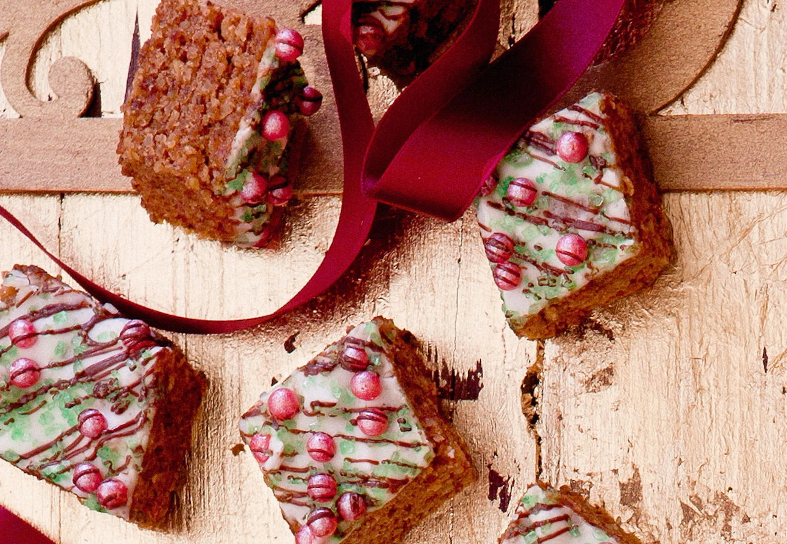 Für die Glasur restliche 2 Eiklar, Staubzucker und Zitronensaft verrühren. Glasur auf dem Kuchen verstreichen und 1 Stunde trocknen lassen. Kuchen mit Schokolade und Perlen garnieren und in Rauten schneiden.