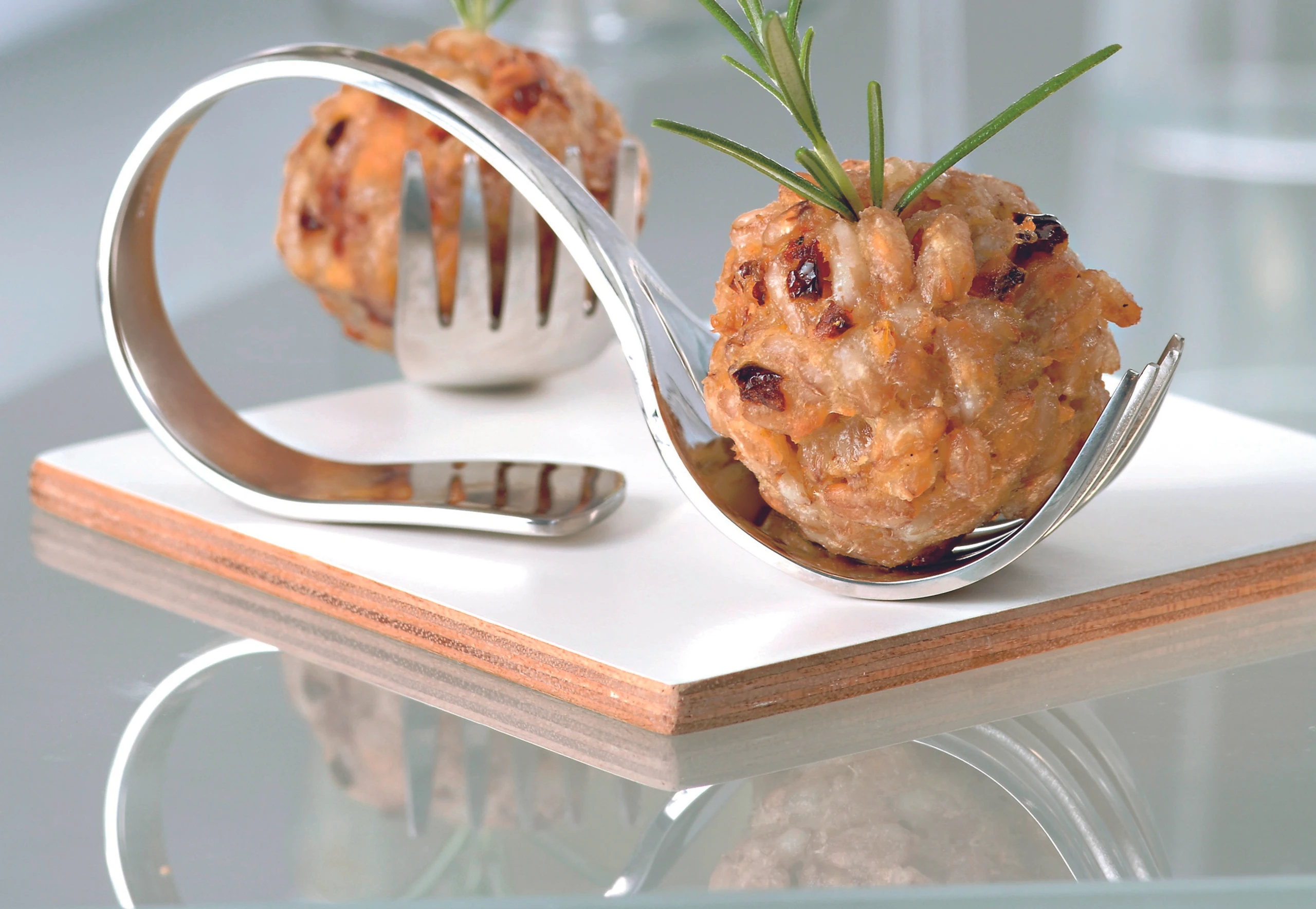 Paradeiser abtropfen lassen und fein schneiden. Dotter, Käse, Paradeiser und Rosmarin mit dem Emmer verrühren. Aus der Masse kleine Knödel formen. Öl erhitzen (ca. 180°C), Bällchen darin goldgelb backen, auf Rosmarinzweige spießen.