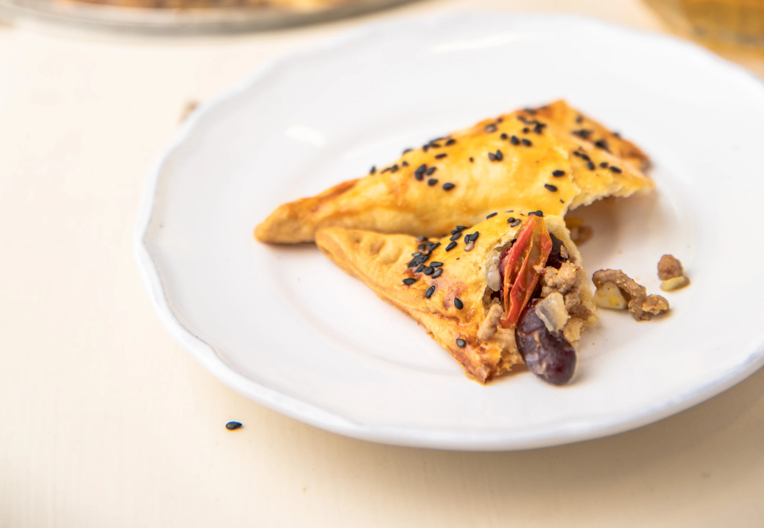 Teig auf einer bemehlten Arbeitsfläche ausrollen und in Quadrate schneiden. Ca. 1 EL Fülle in die Mitte jedes Teigstücks setzen und die Ränder mit Ei bestreichen. Teig über die Fülle zusammenklappen, Ränder zuerst mit den Fingerspitzen, dann mit einer Gabel andrücken.
