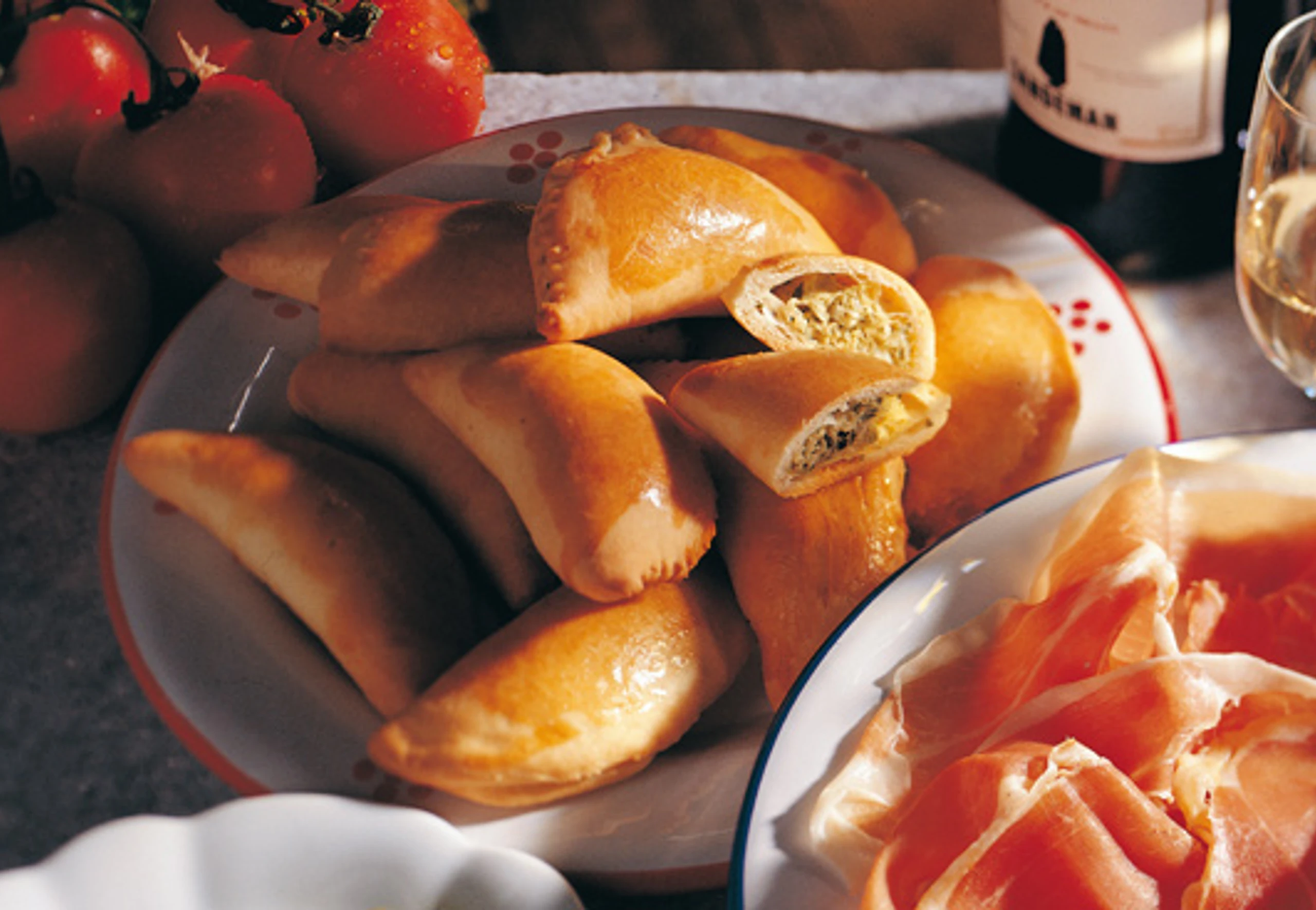 Rohr auf 180°C vorheizen, Backblech mit Backpapier belegen. Dotter verquirlen. Teig auf einer bemehlten Arbeitsfläche dünn ausrollen, Scheiben (Ø 14 cm) ausstechen. Fülle in Häufchen etwas außerhalb der Mitte auf die Teigscheiben setzen. Unbelegte Teighälften über die Fülle klappen, Ränder festdrücken.