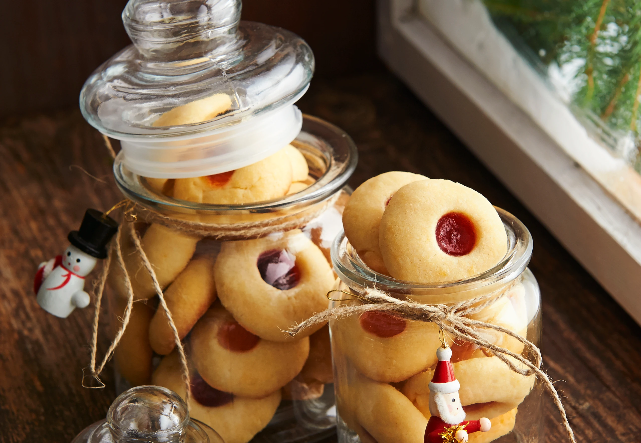 Mit einem Kochlöffelstiel Mulden in die Kugeln drücken, aber nicht durchbohren. Marmeladen in die Mulden füllen. Kekse im Rohr (mittlere Schiene) ca. 10 Minuten backen. (Die Kekse sollen keine Farbe bekommen!) Aus dem Rohr nehmen und abkühlen lassen.