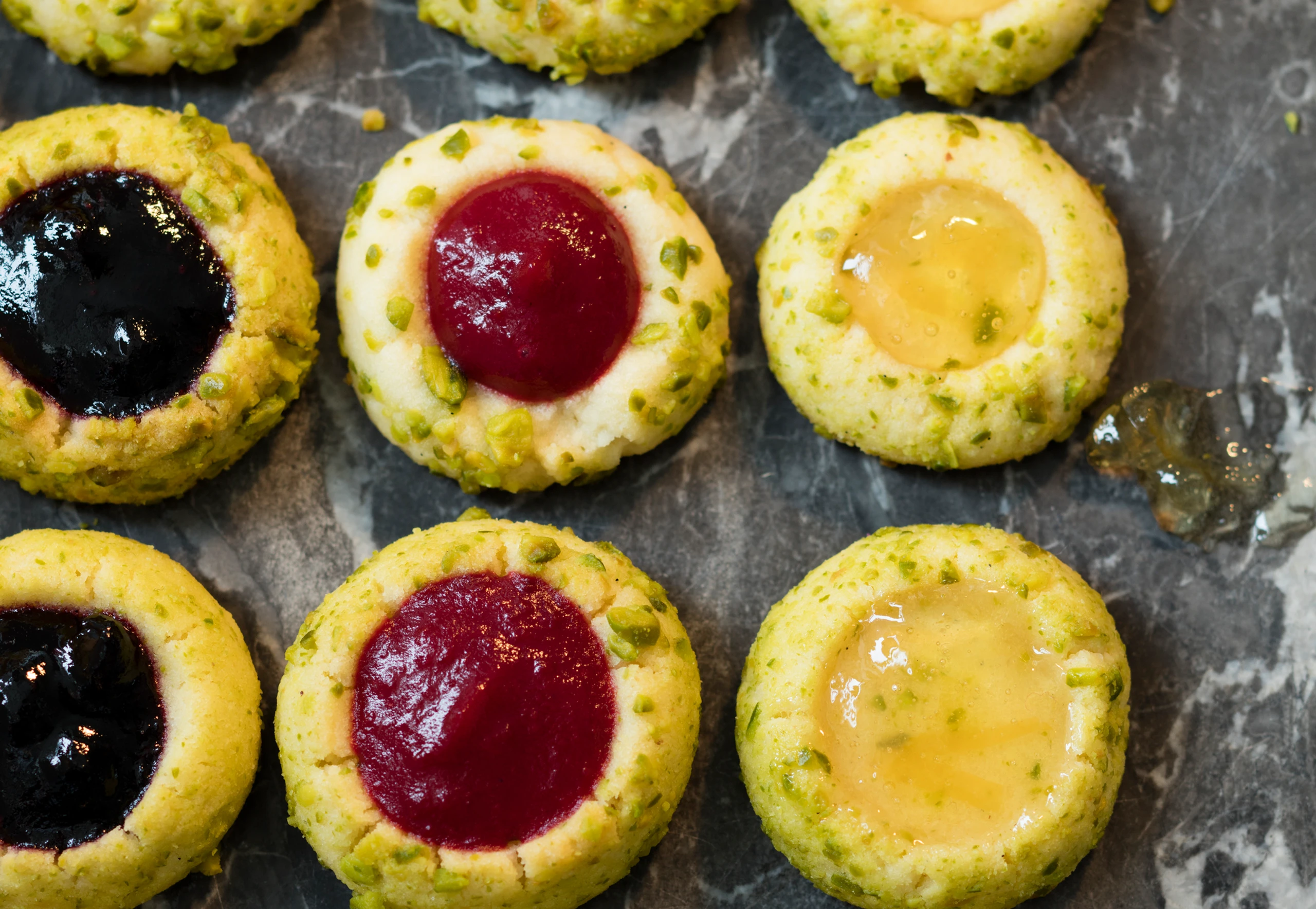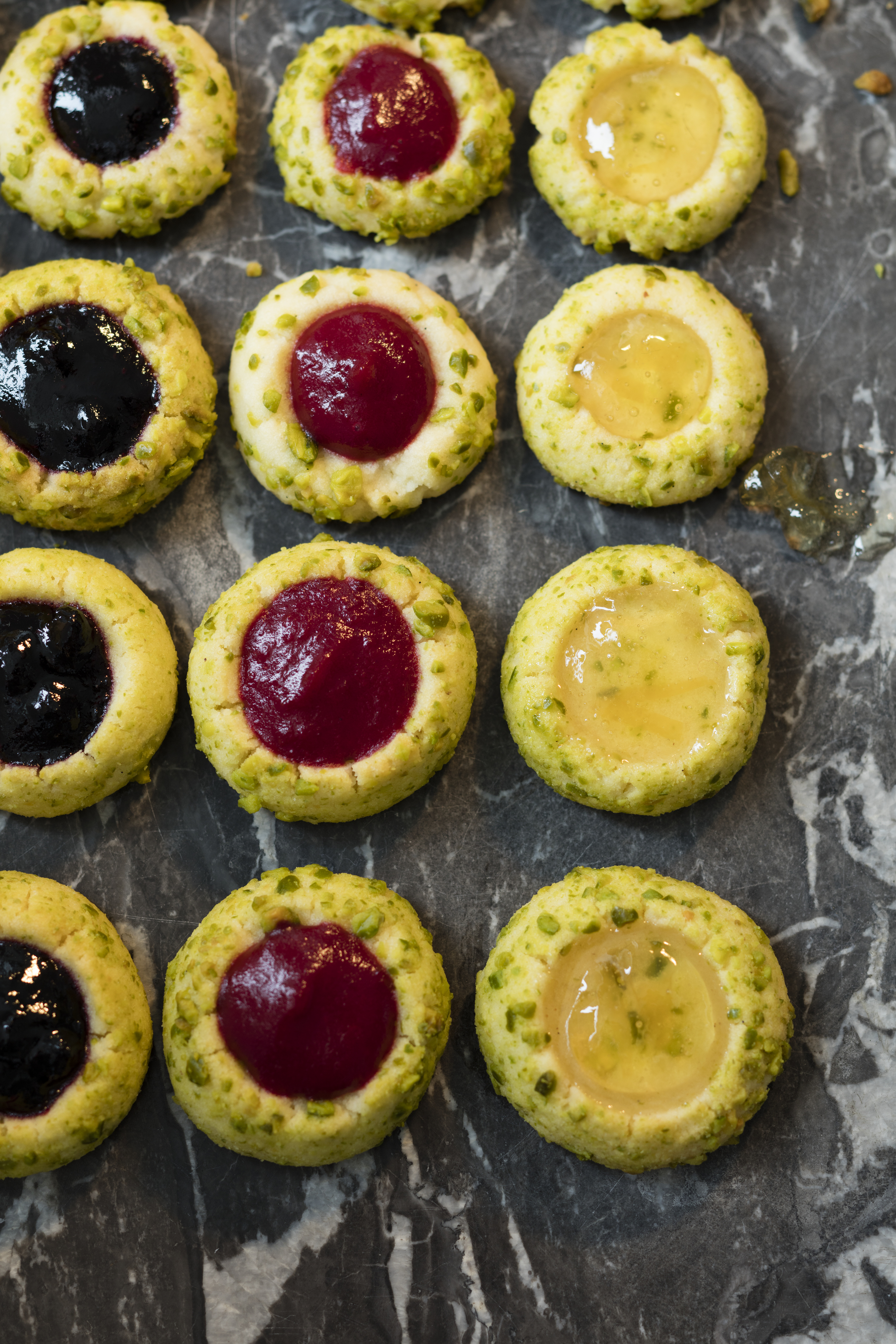 Pistazien grob mahlen. Teig zu einer Rolle formen, ca. 3 cm lange Stücke abschneiden und zu murmelgroßen Kugeln formen, in den Pistazienbröseln wälzen und auf die Backbleche setzen, dabei ca. 3 cm Abstand halten. Mit einem Kochlöffelstiel eine Vertiefung in die Kugeln drücken. Im Rohr (mittlere Schiene) hell backen (ca. 9 Minuten).