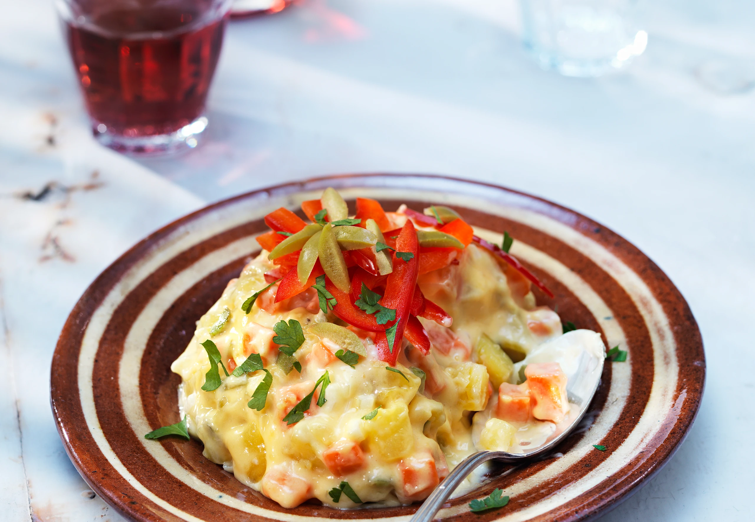 Gemüse und Thunfisch mit der Mayonnaise vermischen. Salat in eine Schüssel oder eine runde Form füllen, glatt verstreichen und für ca. 1 Stunde kühl stellen.