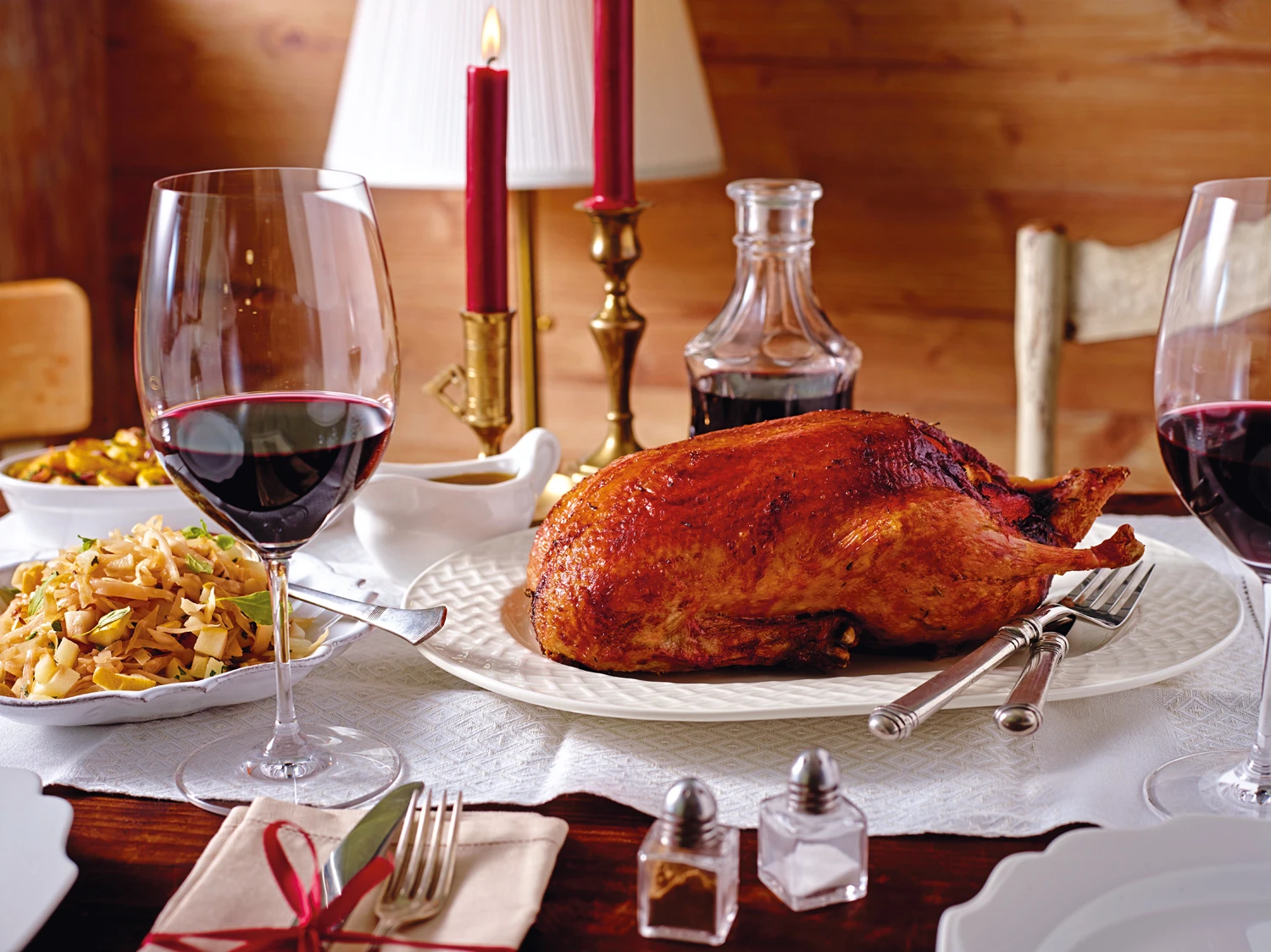 Ente aus dem Rohr nehmen, den Spagat entfernen und die Ente rasten lassen. Saft abseihen und eventuell mit Salz und Pfeffer würzen. Ente portionieren und mit Saft, Kraut und Gröstl anrichten.
