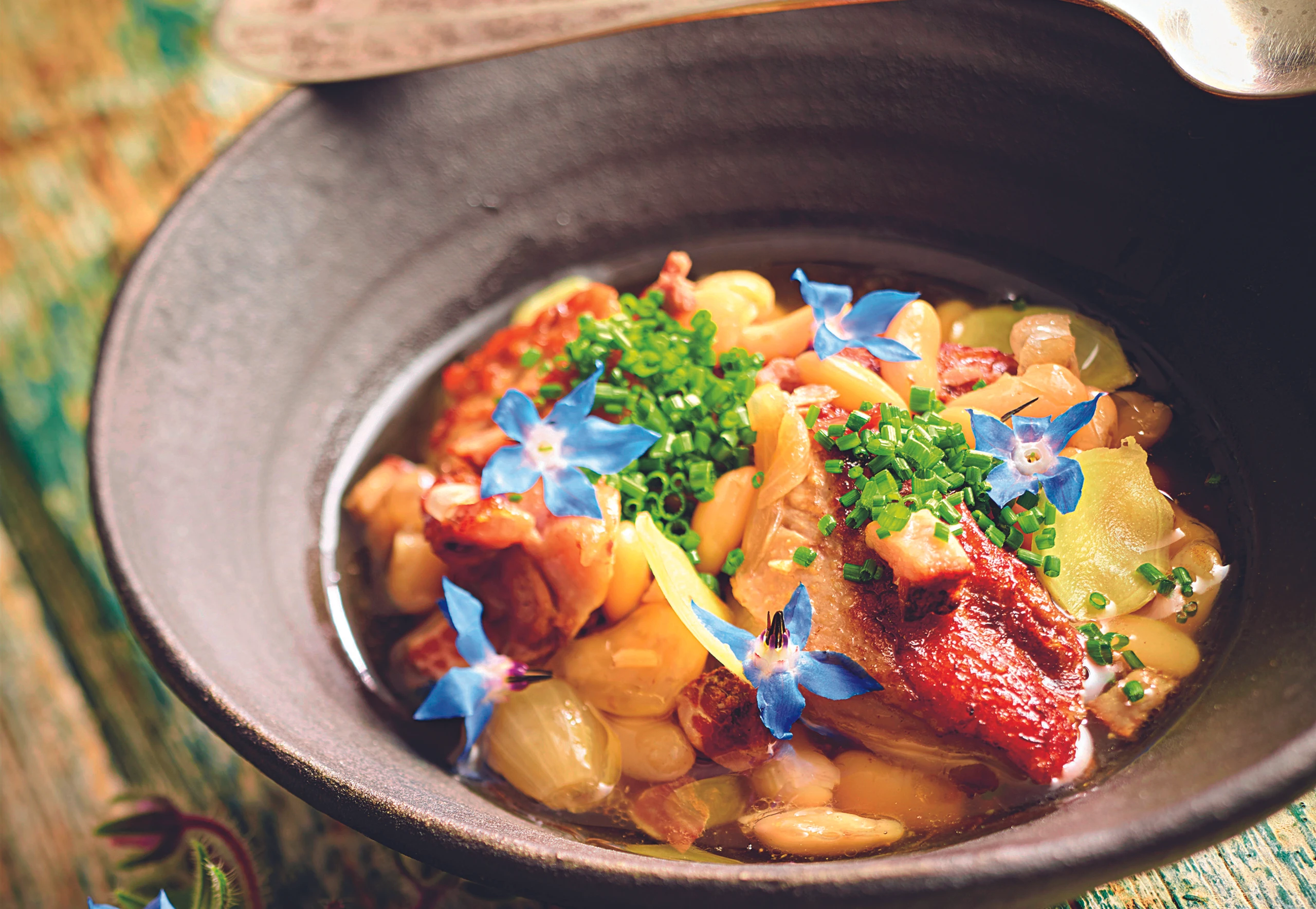 Cassoulet mit Salz und Pfeffer abschmecken, mit Thymian garniert anrichten, evtl. mit Blüten dekorieren.