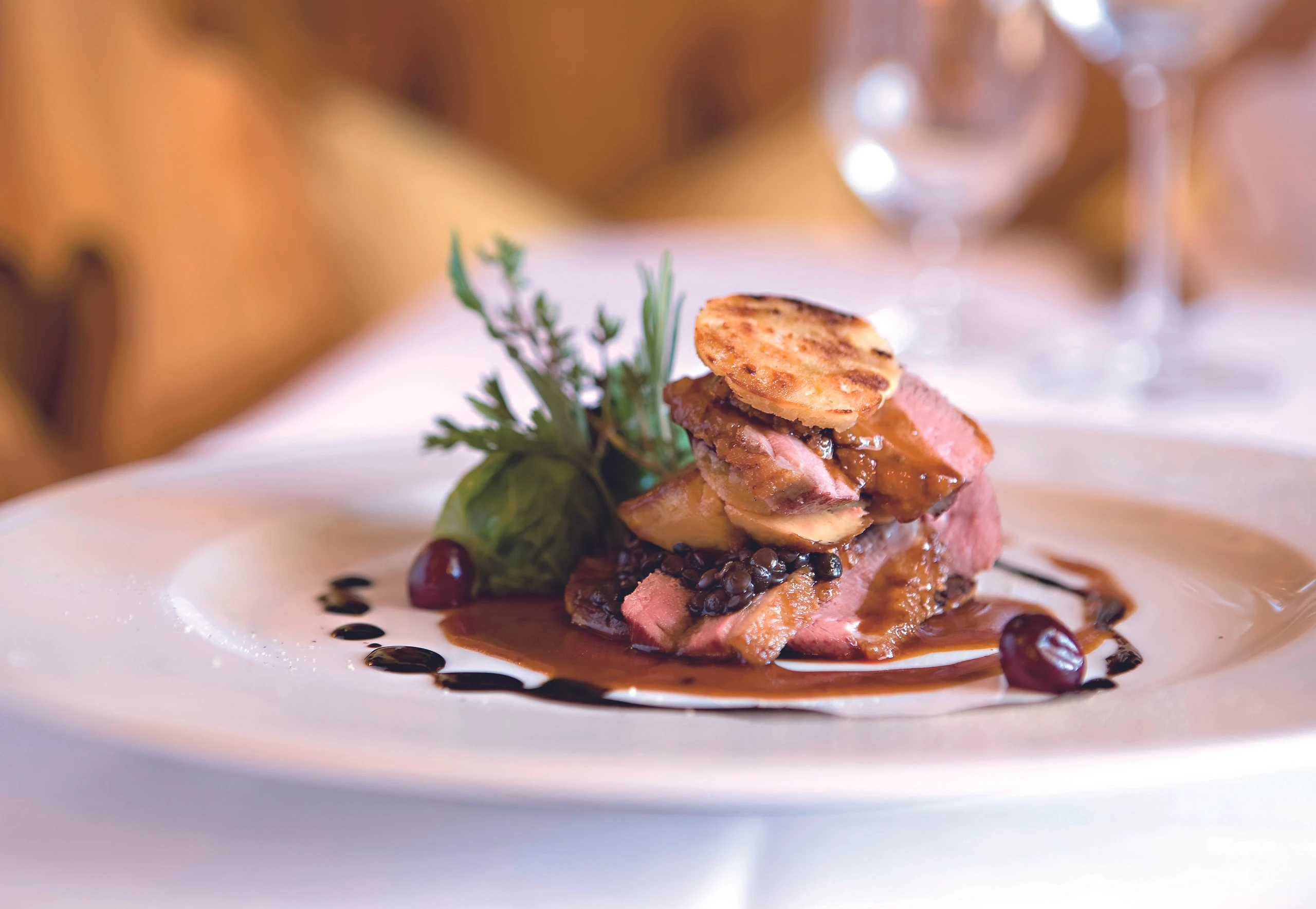 Entenbrüste salzen, pfeffern, auf der Hautseite in Öl scharf anbraten, wenden und im Rohr bei 170°C ca. 6 Minuten braten. Gänseleber in 4 Scheiben schneiden, beidseitig in Öl kurz scharf anbraten.