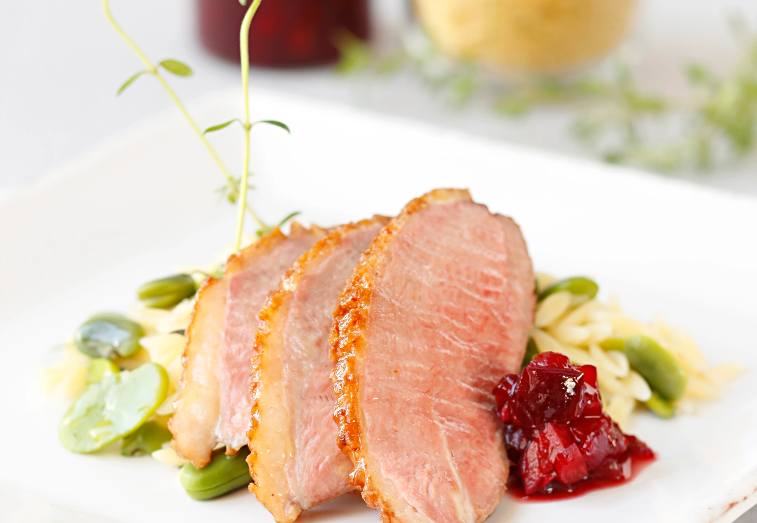 Entenbrust mit Bohnen-Risoni und Zwetschken-Chutney