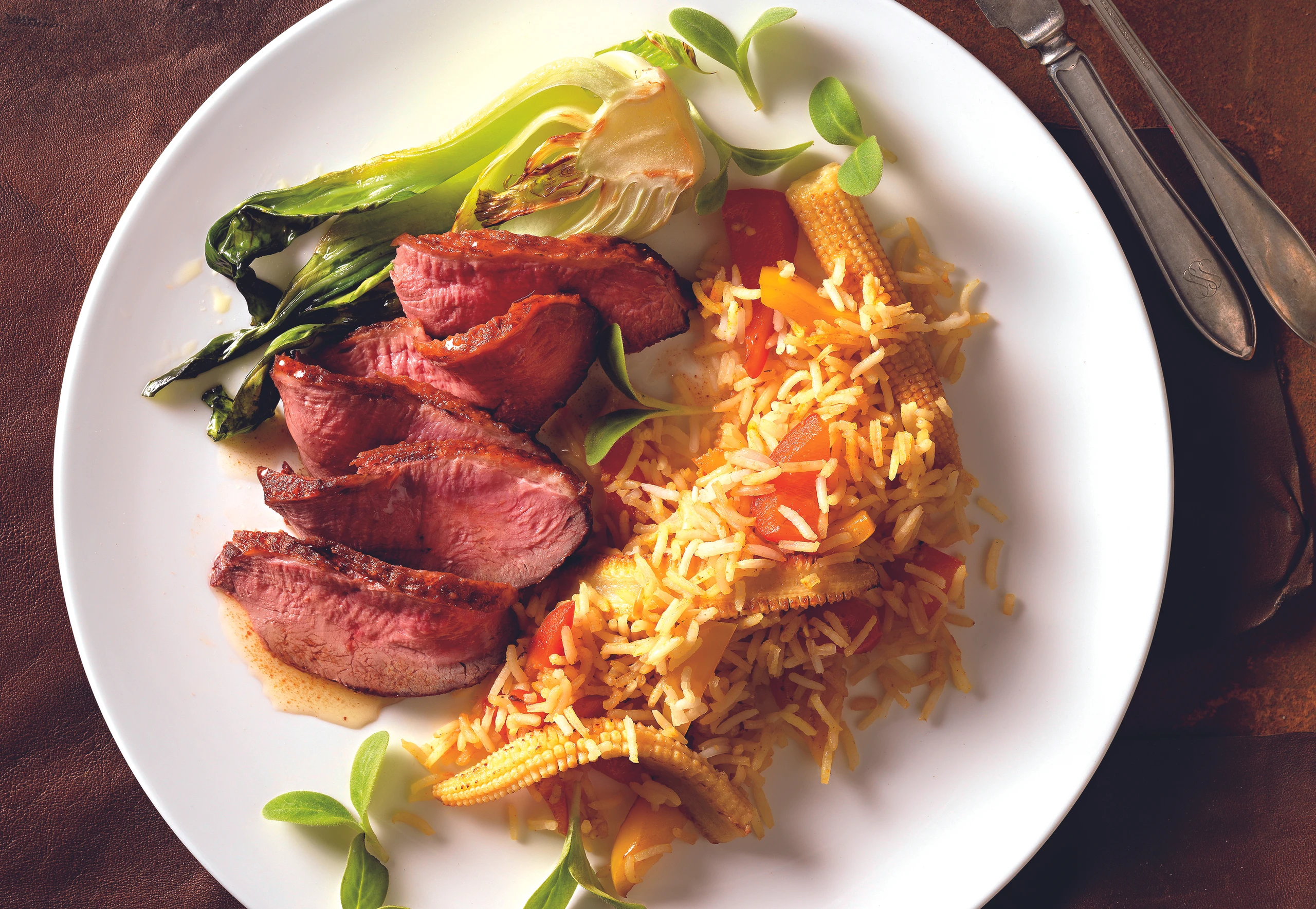 Entenbrust in Scheiben schneiden, mit Pak Choi und Gemüsereis anrichten und mit Kresse garniert servieren.