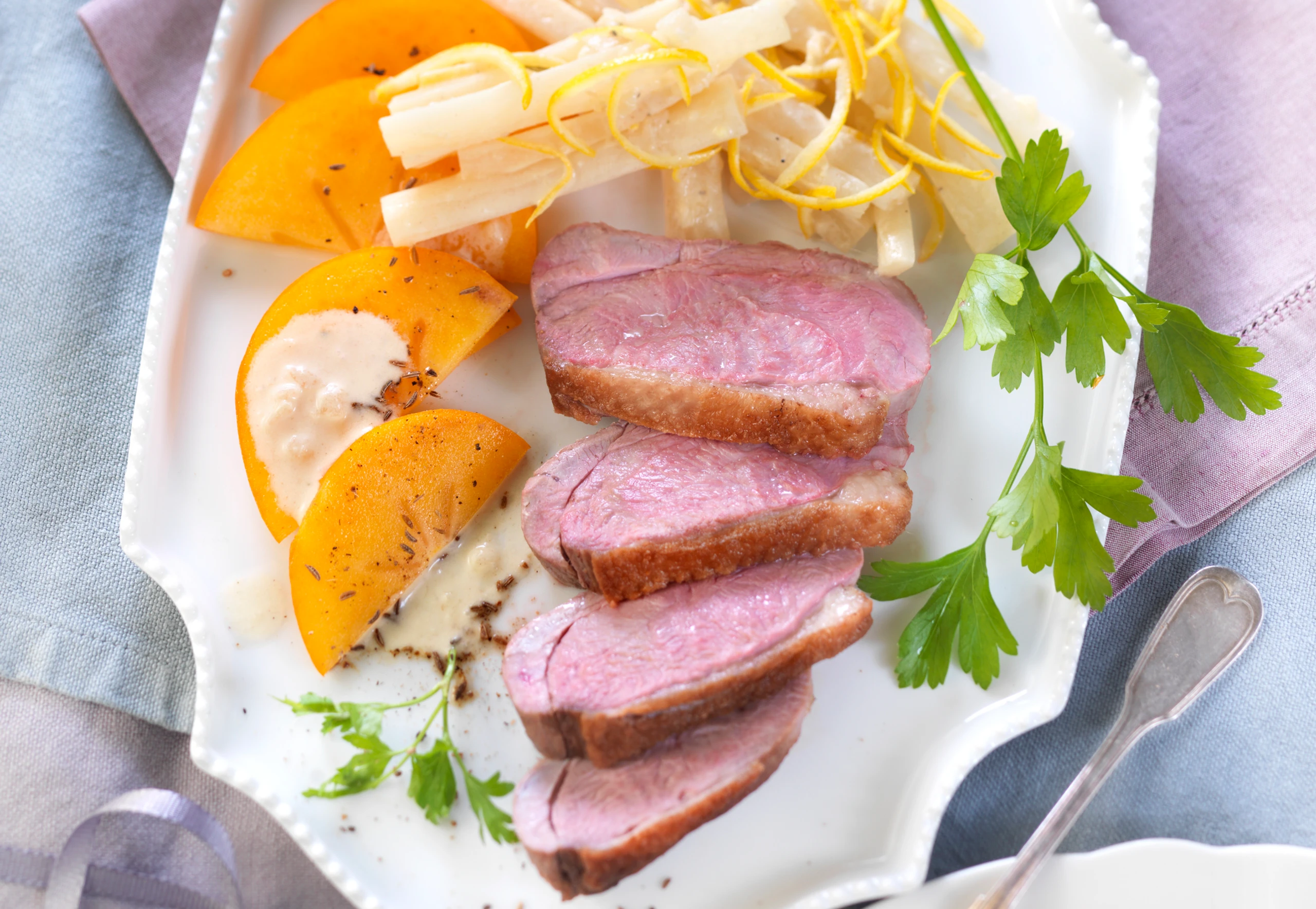 Sharonfrucht halbieren und in dünne Scheiben schneiden. Entenbrust mit Sharonfrucht und Schwarzwurzeln anrichten, mit Koriander garnieren.
