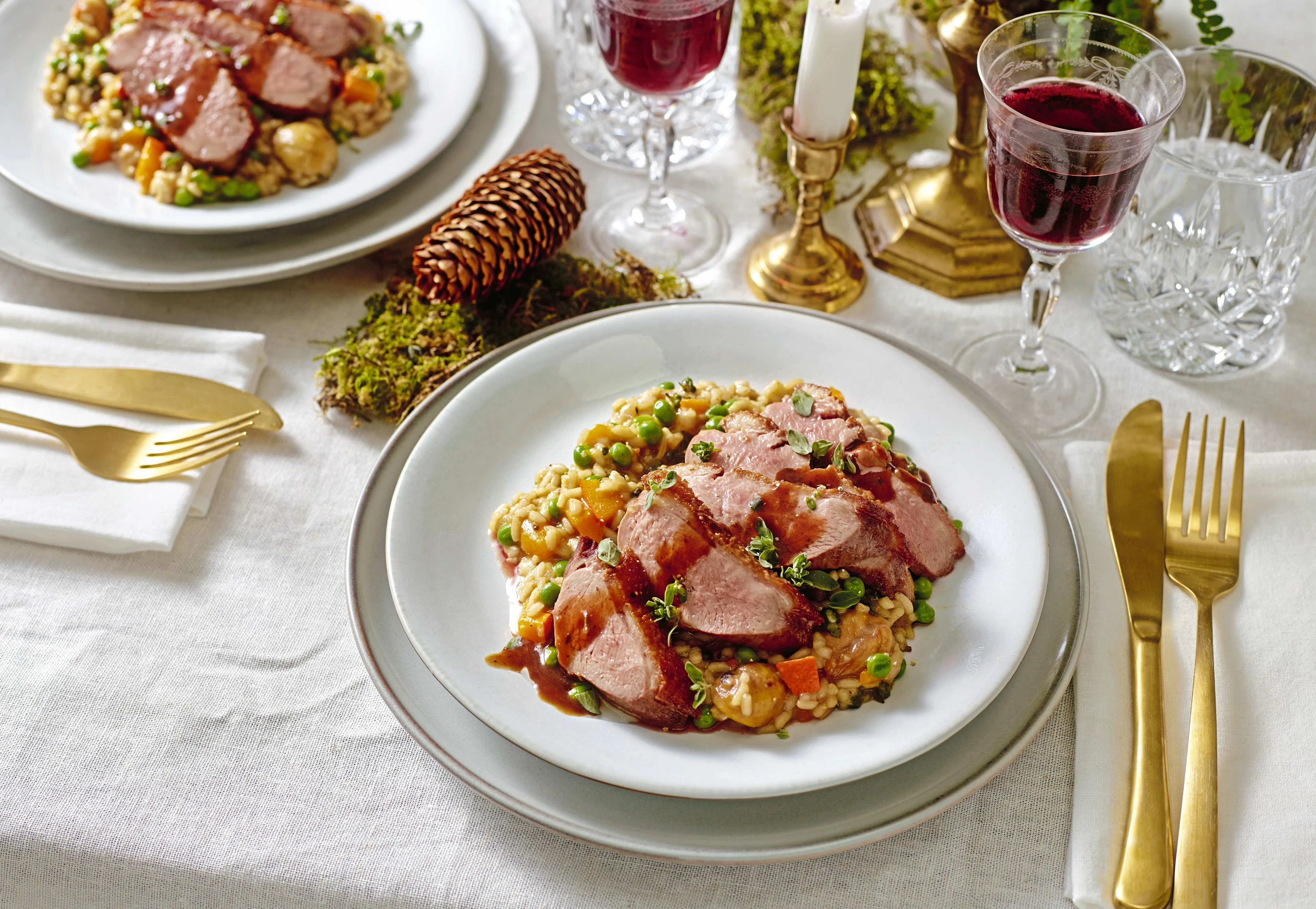 Entenbrust mit Kürbis-Erbsenrisotto und Majoran