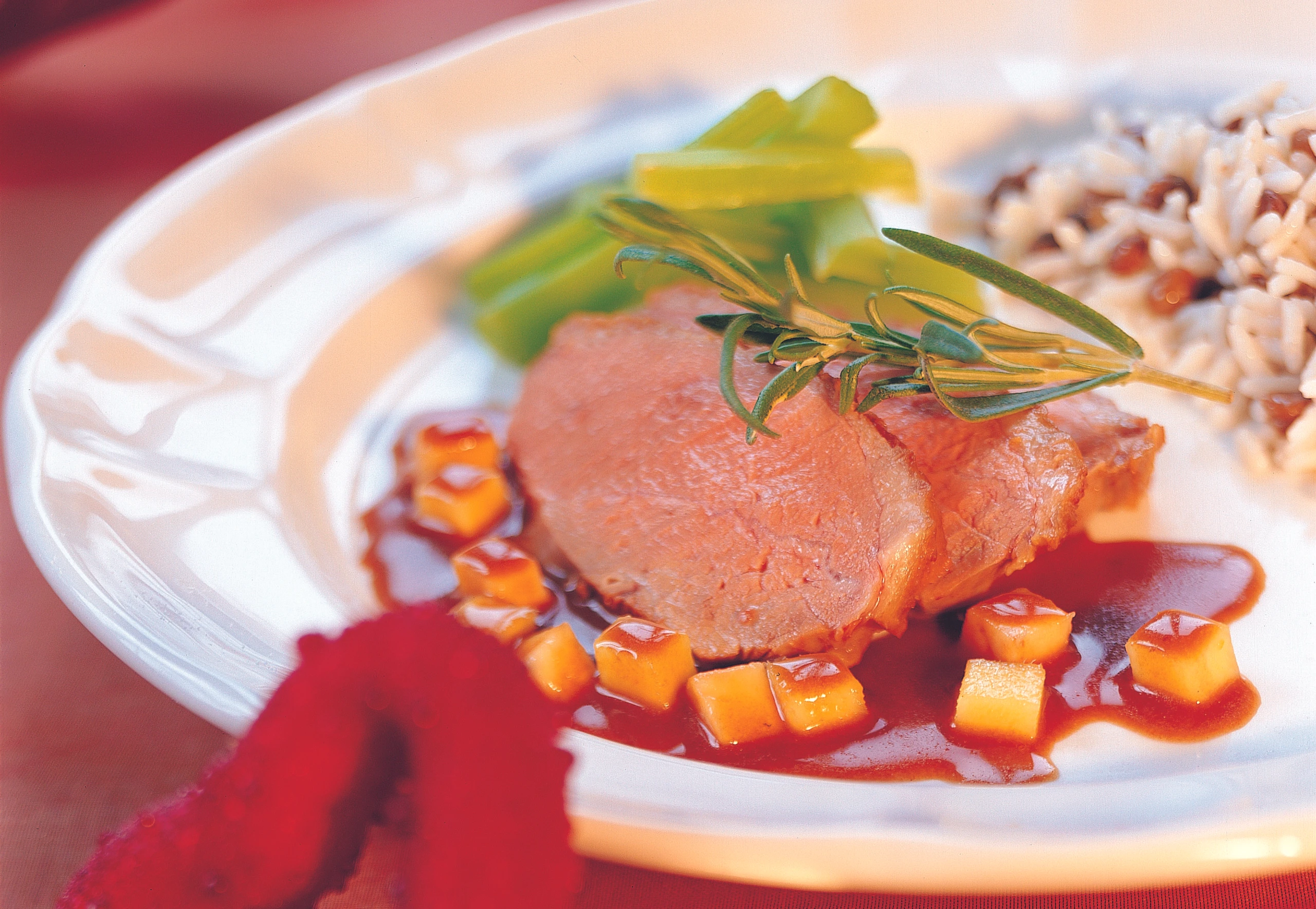 Entenbrüste aus der Pfanne nehmen und zugedeckt warm stellen. Bratfett abgießen. Bratrückstand mit Bratensaft aufgießen und aufkochen. Früchte einrühren und kurz ziehen lassen. Fleisch in Scheiben schneiden, mit der Sauce und den Beilagen anrichten.