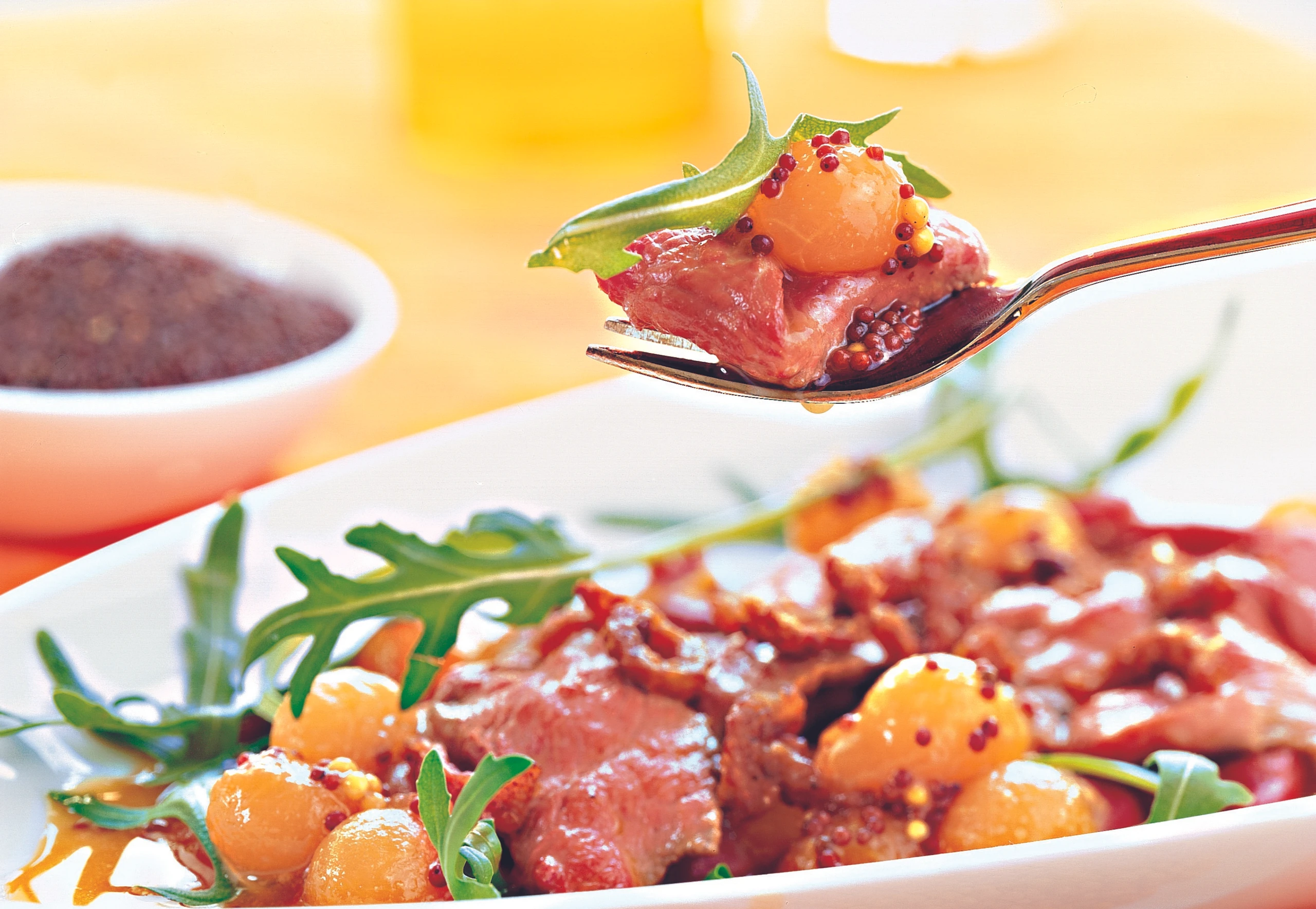 Rohr auf Grillstufe oder höchste Stufe Oberhitze vorheizen. Melonenkugeln in der Marinade erwärmen und auf Tellern anrichten. Filets quer in dünne Scheiben schneiden und darauf legen. Gericht im Rohr ca. 1 Minute erhitzen – das Fleisch soll rosa bleiben. Salzen, pfeffern, mit Krusteln und Rucola garnieren.
