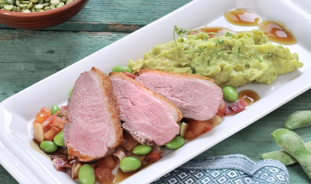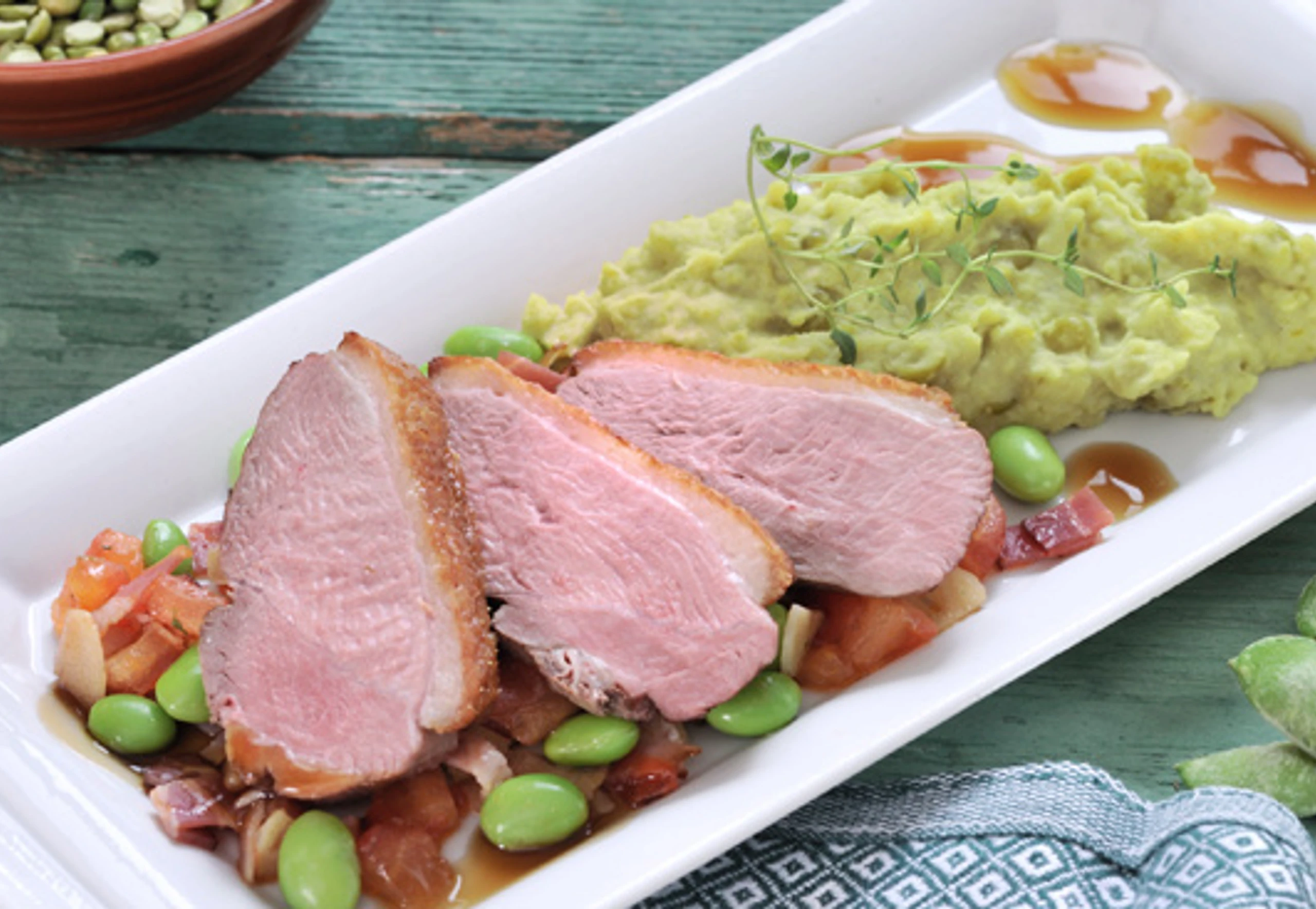 Entenbrust mit Erbsenpüree und Sojabohnengemüse