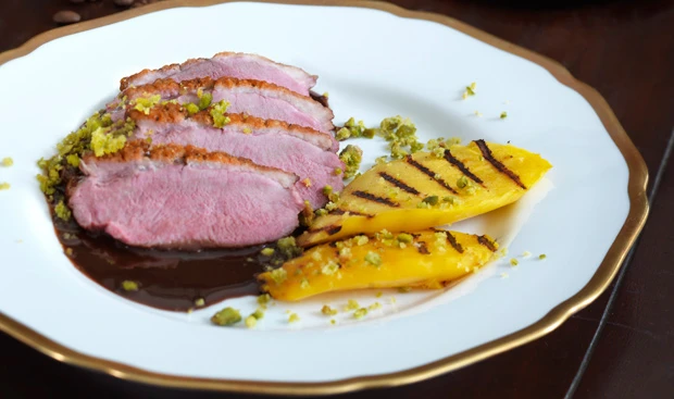- Entenbrüste in Scheiben schneiden, mit Mango, Sauce und Pistazienstreusel anrichten.